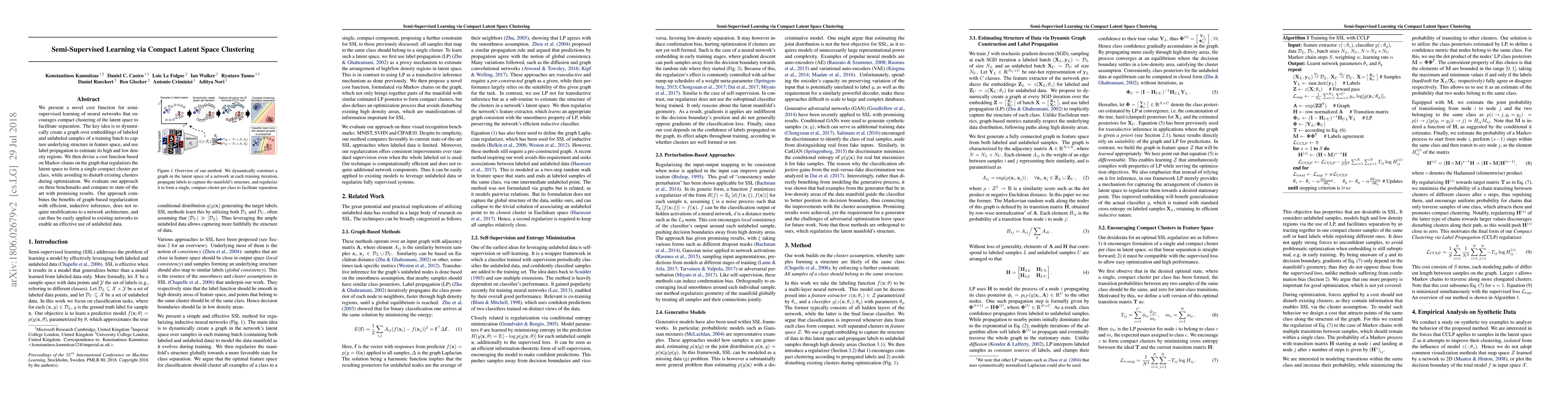 This paper introduces a novel method for semi-supervised learning that clusters latent space to facilitate separation, achieving promising results on three benchmarks without requiring modifications to network architectures.