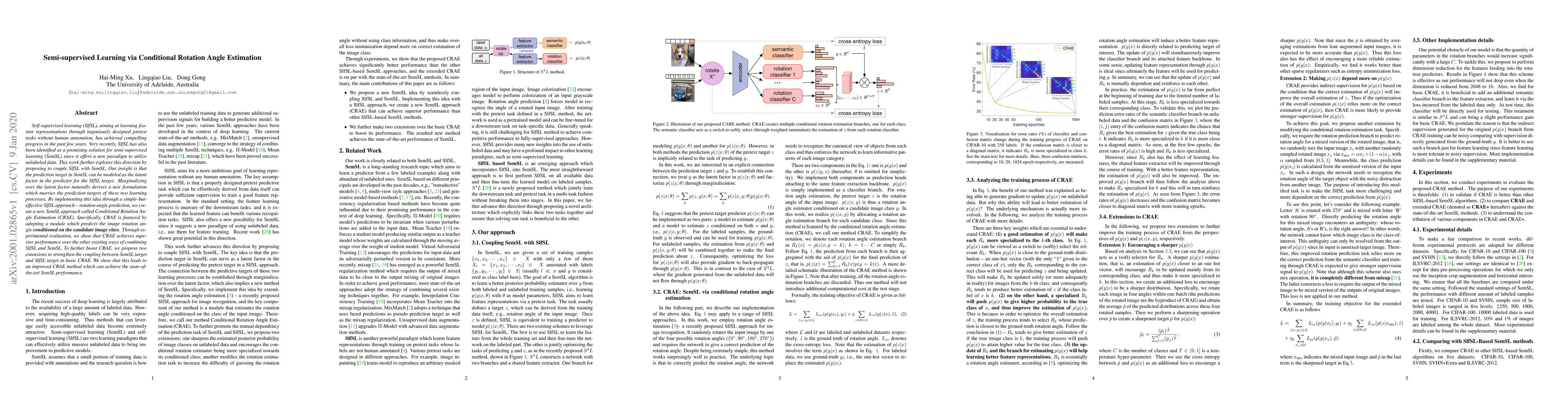 This research introduces Conditional Rotation Angle Estimation (CRAE), a method that combines self-supervised learning (SlfSL) and semi-supervised learning (SemSL) for improved image classification. CRAE predicts image rotation angles conditioned on candidate classes, outperforming existing methods and achieving state-of-the-art SemSL results.