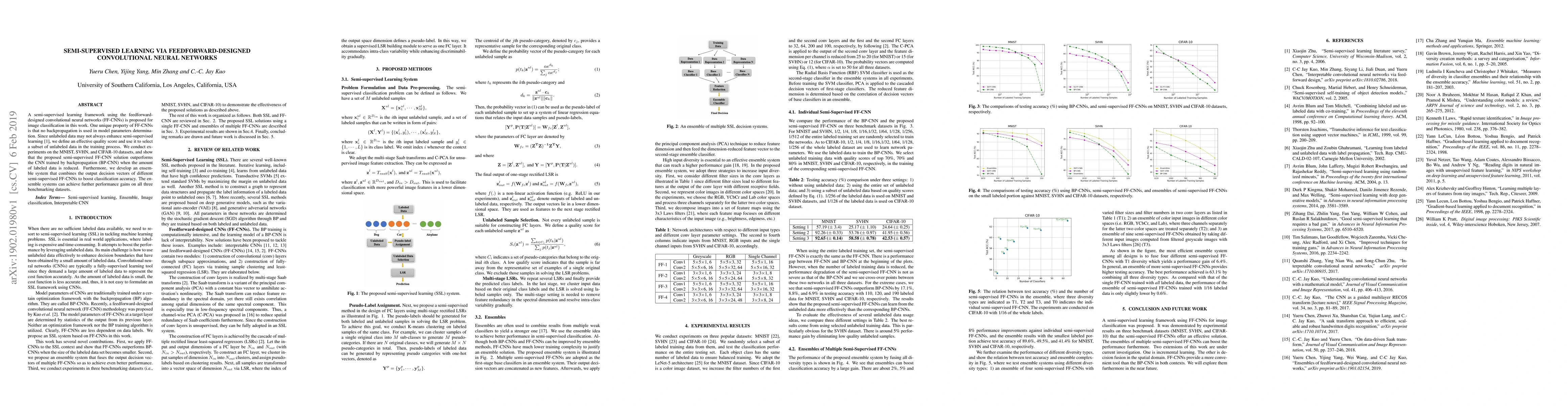 This paper proposes a semi-supervised learning framework using feedforward-designed convolutional neural networks (FF-CNNs) that outperform backpropagation-trained CNNs with limited labeled data. An effective quality score is used to select unlabeled data, and an ensemble system combining multiple FF-CNNs further enhances classification accuracy on MNIST, SVHN, and CIFAR-10 datasets.