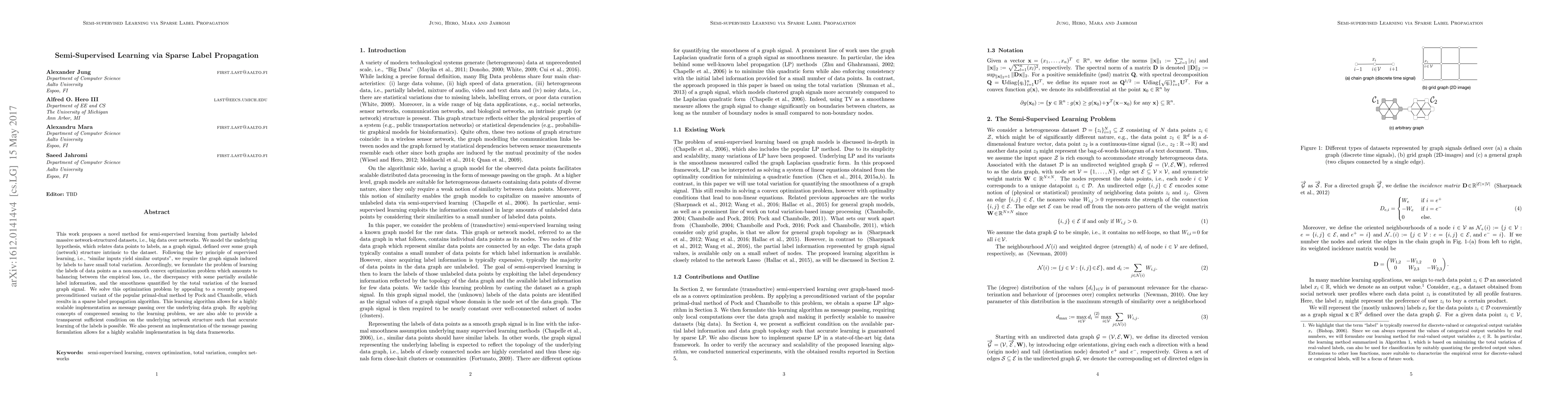 This paper introduces a novel semi-supervised learning method for large network-structured datasets, utilizing sparse label propagation through a graph signal model. It leverages a preconditioned primal-dual optimization approach to balance empirical loss and label smoothness, enabling scalable implementation via message passing.