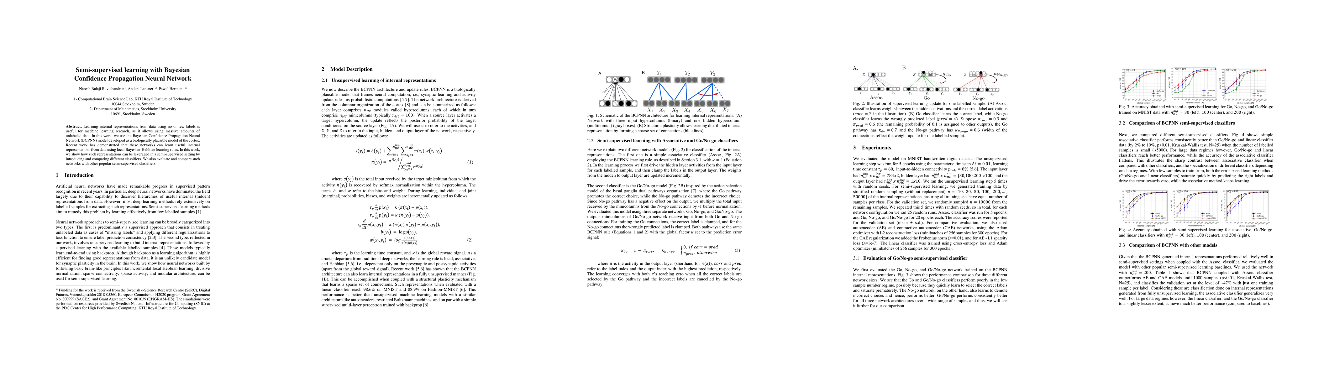 This paper explores semi-supervised learning using the Bayesian Confidence Propagation Neural Network (BCPNN), demonstrating its ability to learn internal representations from unlabeled data. It introduces various classifiers to leverage these representations and compares BCPNN performance against other semi-supervised learning methods.