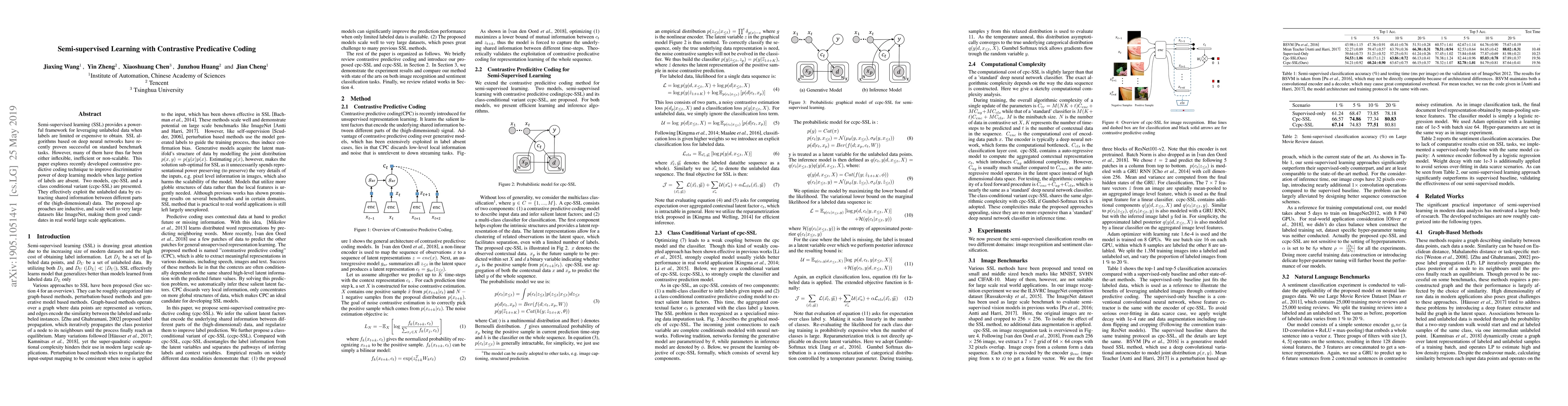 Semi-supervised learning (SSL) provides a powerful framework for leveraging unlabeled data when labels are limited or expensive to obtain. SSL algorithms based on deep neural networks have recently proven successful on standard benchmark tasks. However, many of them have thus far been either inflexible, inefficient or non-scalable. This paper explores recently developed contrastive predictive coding technique to improve discriminative power of deep learning models when a large portion of labels are absent. Two models, cpc-SSL and a class conditional variant~(ccpc-SSL) are presented. They effectively exploit the unlabeled data by extracting shared information between different parts of the (high-dimensional) data. The proposed approaches are inductive, and scale well to very large datasets like ImageNet, making them good candidates in real-world large scale applications.