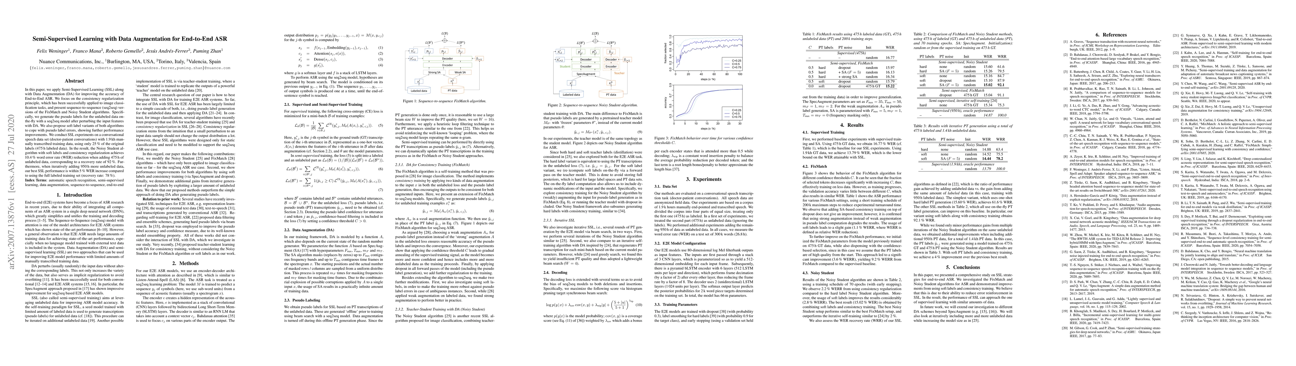In this paper, we apply Semi-Supervised Learning (SSL) along with Data Augmentation (DA) for improving the accuracy of End-to-End ASR. We focus on the consistency regularization principle, which has been successfully applied to image classification tasks, and present sequence-to-sequence (seq2seq) versions of the FixMatch and Noisy Student algorithms. Specifically, we generate the pseudo labels for the unlabeled data on-the-fly with a seq2seq model after perturbing the input features with DA. We also propose soft label variants of both algorithms to cope with pseudo label errors, showing further performance improvements. We conduct SSL experiments on a conversational speech data set with 1.9kh manually transcribed training data, using only 25% of the original labels (475h labeled data). In the result, the Noisy Student algorithm with soft labels and consistency regularization achieves 10.4% word error rate (WER) reduction when adding 475h of unlabeled data, corresponding to a recovery rate of 92%. Furthermore, when iteratively adding 950h more unlabeled data, our best SSL performance is within 5% WER increase compared to using the full labeled training set (recovery rate: 78%).