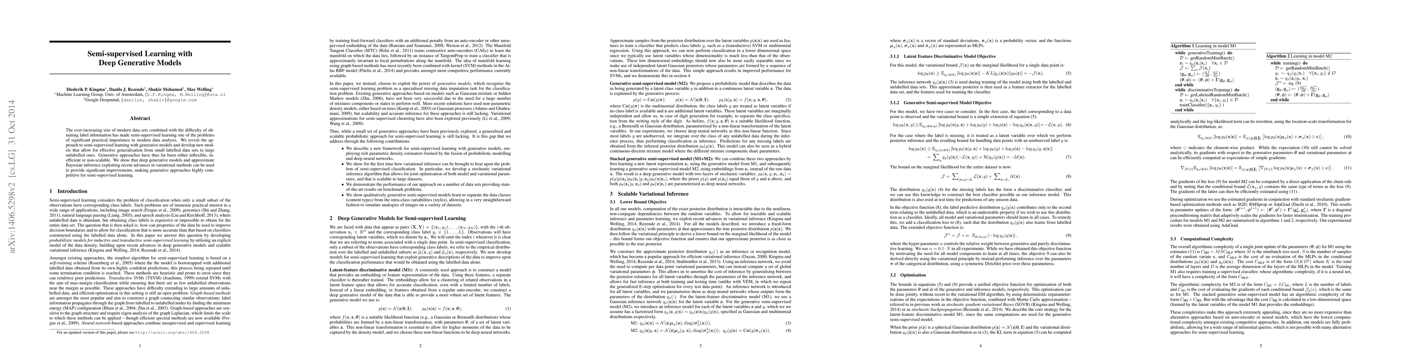 The ever-increasing size of modern data sets combined with the difficulty of obtaining label information has made semi-supervised learning one of the problems of significant practical importance in modern data analysis. We revisit the approach to semi-supervised learning with generative models and develop new models that allow for effective generalisation from small labelled data sets to large unlabelled ones. Generative approaches have thus far been either inflexible, inefficient or non-scalable. We show that deep generative models and approximate Bayesian inference exploiting recent advances in variational methods can be used to provide significant improvements, making generative approaches highly competitive for semi-supervised learning.