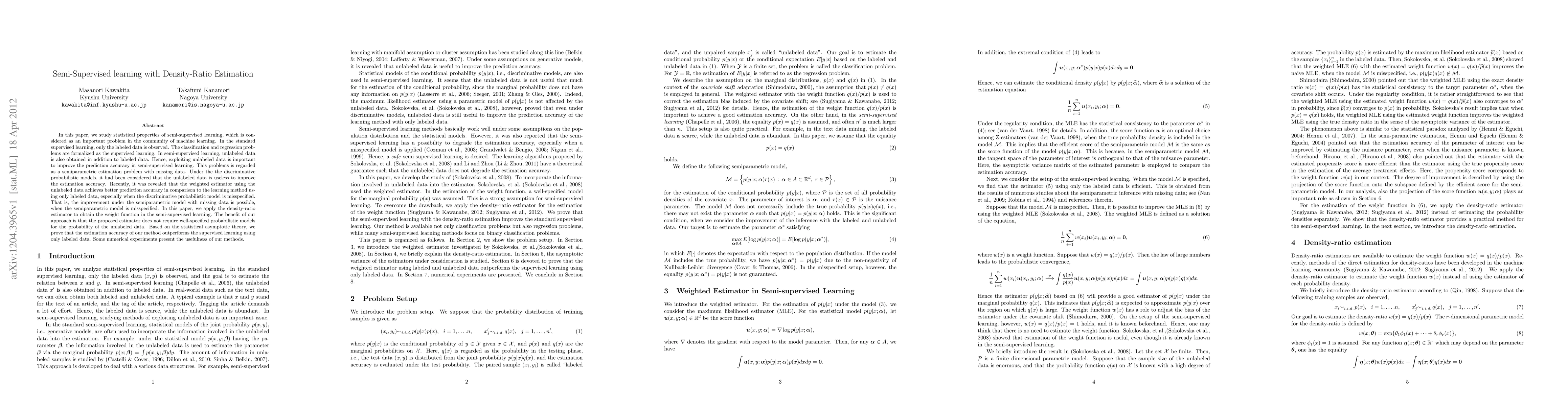 In this paper, we study statistical properties of semi-supervised learning, which is considered as an important problem in the community of machine learning. In the standard supervised learning, only the labeled data is observed. The classification and regression problems are formalized as the supervised learning. In semi-supervised learning, unlabeled data is also obtained in addition to labeled data. Hence, exploiting unlabeled data is important to improve the prediction accuracy in semi-supervised learning. This problems is regarded as a semiparametric estimation problem with missing data. Under the the discriminative probabilistic models, it had been considered that the unlabeled data is useless to improve the estimation accuracy. Recently, it was revealed that the weighted estimator using the unlabeled data achieves better prediction accuracy in comparison to the learning method using only labeled data, especially when the discriminative probabilistic model is misspecified. That is, the improvement under the semiparametric model with missing data is possible, when the semiparametric model is misspecified. In this paper, we apply the density-ratio estimator to obtain the weight function in the semi-supervised learning. The benefit of our approach is that the proposed estimator does not require well-specified probabilistic models for the probability of the unlabeled data. Based on the statistical asymptotic theory, we prove that the estimation accuracy of our method outperforms the supervised learning using only labeled data. Some numerical experiments present the usefulness of our methods.