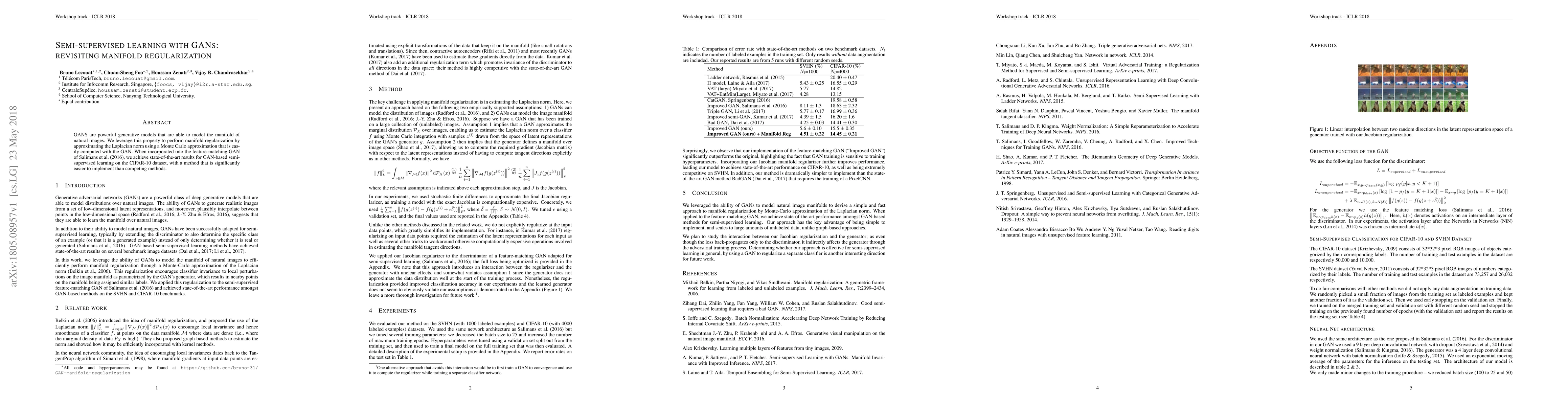 This paper proposes a semi-supervised learning method for GANs that utilizes manifold regularization by approximating the Laplacian norm with a Monte Carlo approach. This method achieves state-of-the-art results on CIFAR-10 with an easier implementation compared to other techniques.