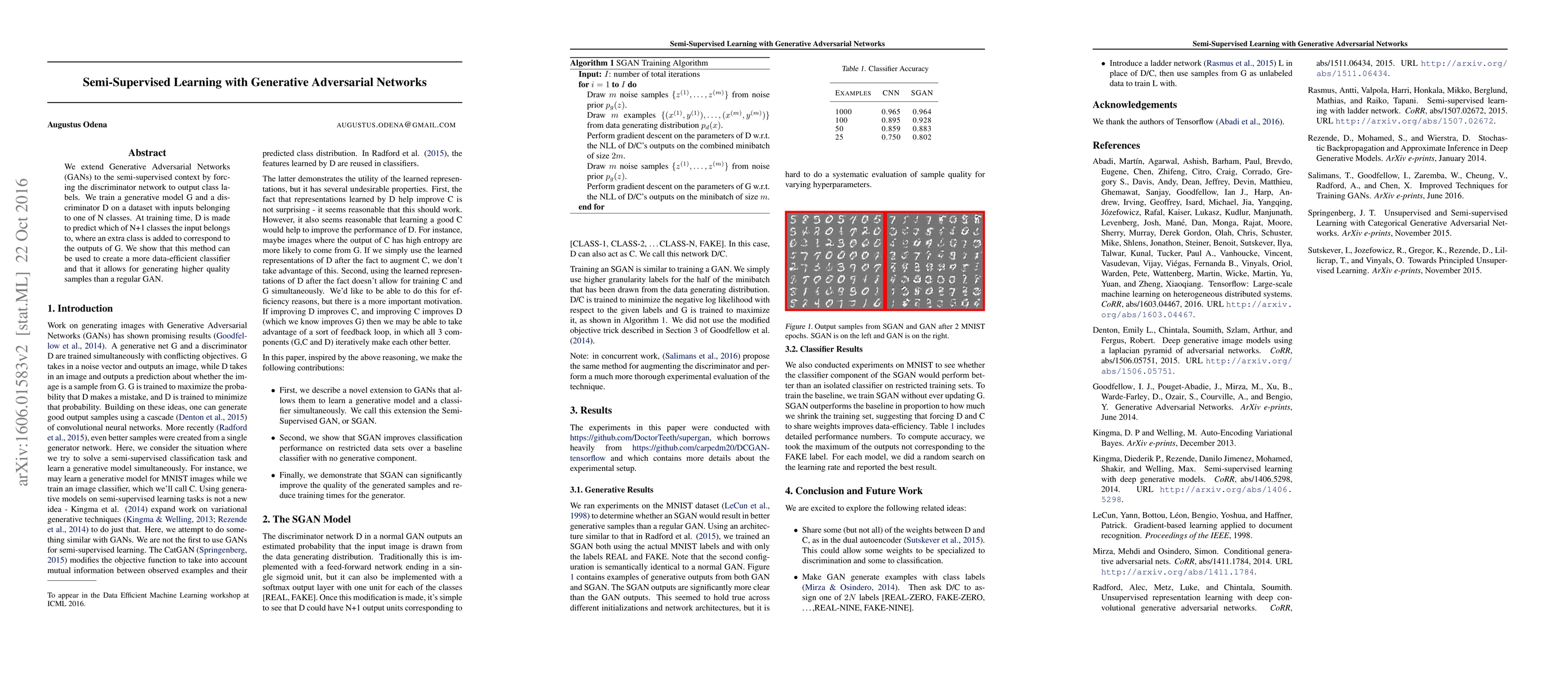 This paper proposes a semi-supervised learning approach using GANs where the discriminator predicts class labels, including a synthetic class for generated samples. This method enhances classifier efficiency and improves sample quality compared to traditional GANs.