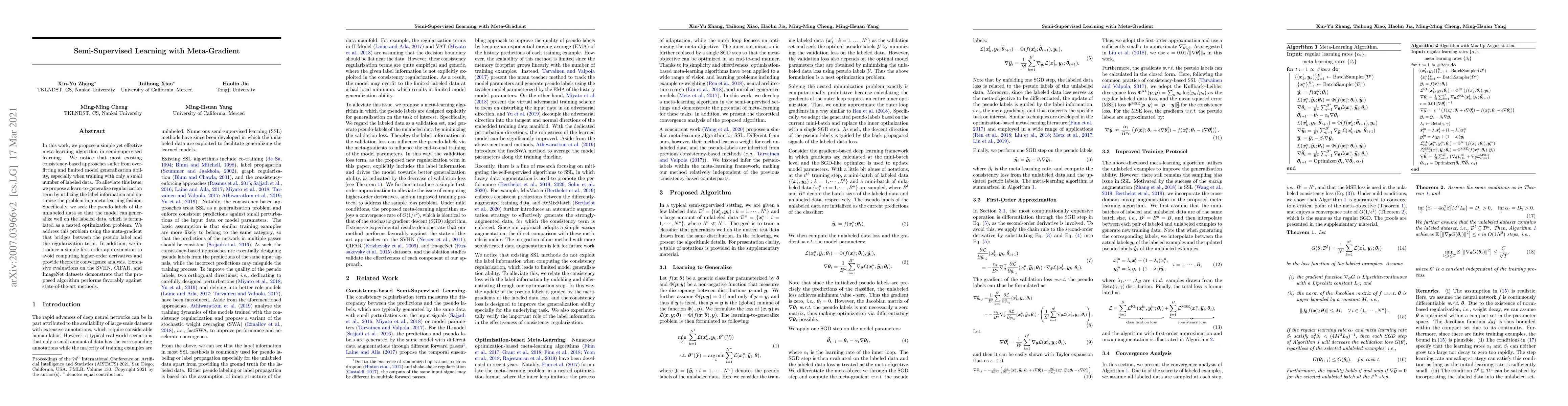 This paper proposes a meta-learning algorithm for semi-supervised learning that introduces a learn-to-generalize regularization term to improve model generalization, addressing overfitting with a meta-gradient optimization approach and demonstrating favorable performance on SVHN, CIFAR, and ImageNet datasets.
