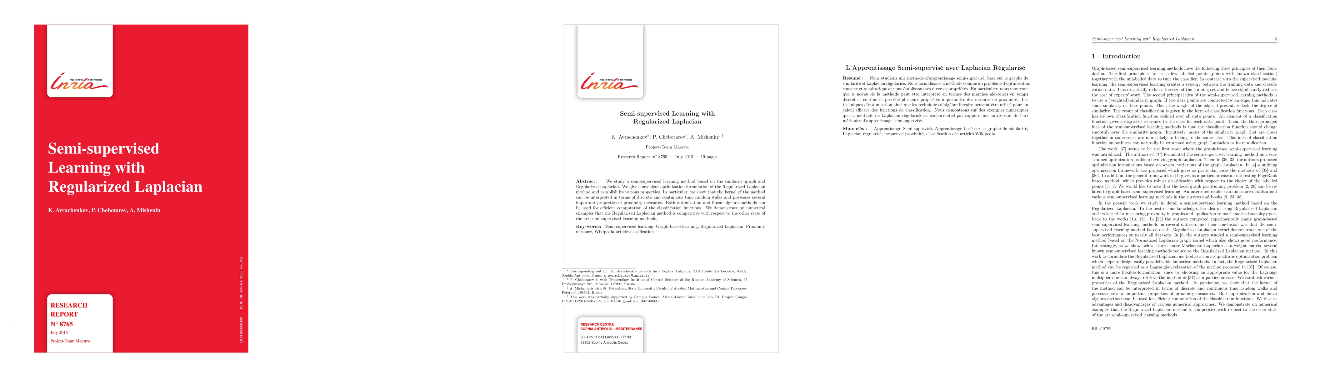 We study a semi-supervised learning method based on the similarity graph and RegularizedLaplacian. We give convenient optimization formulation of the Regularized Laplacian method and establishits various properties. In particular, we show that the kernel of the methodcan be interpreted in terms of discrete and continuous time random walks and possesses several importantproperties of proximity measures. Both optimization and linear algebra methods can be used for efficientcomputation of the classification functions. We demonstrate on numerical examples that theRegularized Laplacian method is competitive with respect to the other state of the art semi-supervisedlearning methods.