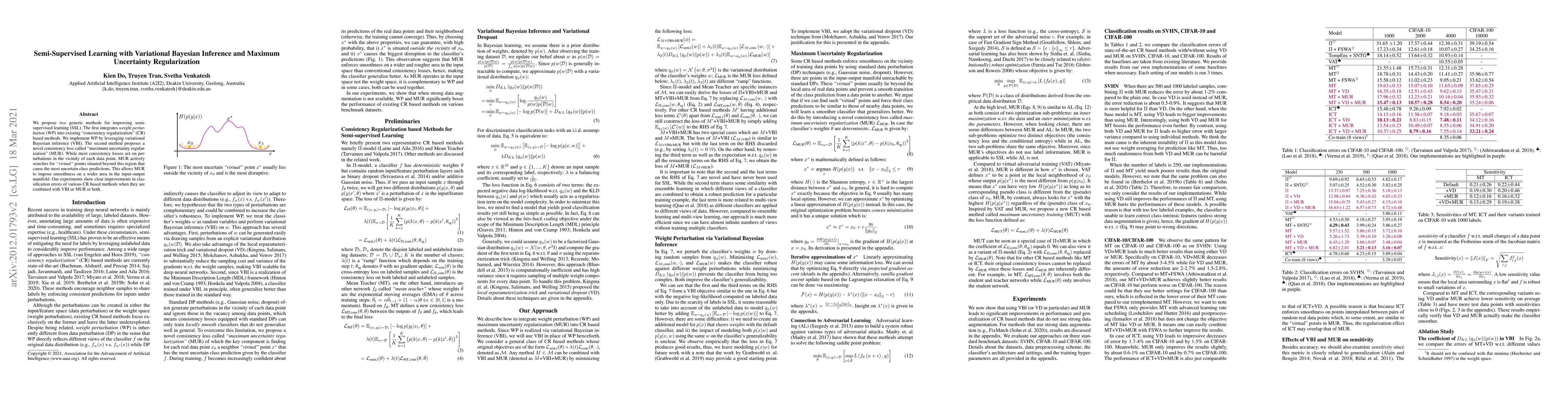 This paper introduces two methods to enhance semi-supervised learning: one integrates variational Bayesian inference into consistency regularization, and the other proposes a novel maximum uncertainty regularization that seeks out "virtual" points to enforce smoother predictions across a broader input-output manifold. Experiments show improved classification performance when these methods are applied.