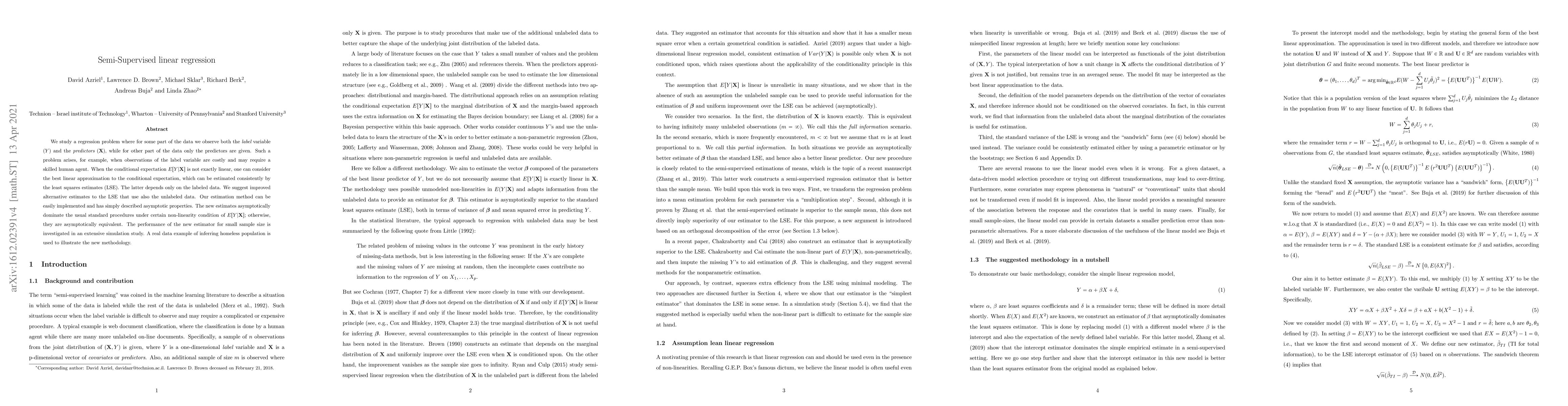 We study a regression problem where for some part of the data we observe both the label variable ($Y$) and the predictors (${\bf X}$), while for other part of the data only the predictors are given. Such a problem arises, for example, when observations of the label variable are costly and may require a skilled human agent. When the conditional expectation $E[Y | {\bf X}]$ is not exactly linear, one can consider the best linear approximation to the conditional expectation, which can be estimated consistently by the least squares estimates (LSE). The latter depends only on the labeled data. We suggest improved alternative estimates to the LSE that use also the unlabeled data. Our estimation method can be easily implemented and has simply described asymptotic properties.The new estimates asymptotically dominate the usual standard procedures under certain non-linearity condition of $E[Y | {\bf X}]$; otherwise, they are asymptotically equivalent.The performance of the new estimator for small sample size is investigated in an extensive simulation study. A real data example of inferring homeless population is used to illustrate the new methodology.
