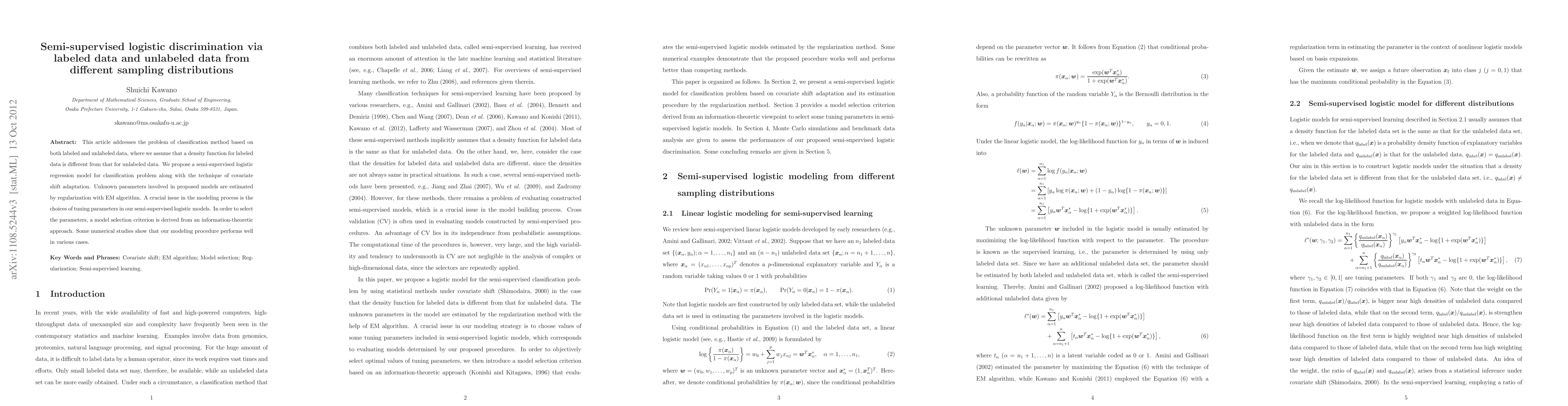 This paper proposes a semi-supervised logistic regression model that utilizes both labeled and unlabeled data from different sampling distributions, employing covariate shift adaptation and regularization with the EM algorithm. A model selection criterion based on information-theoretic approach is used to determine tuning parameters, demonstrating effective performance in various numerical studies.