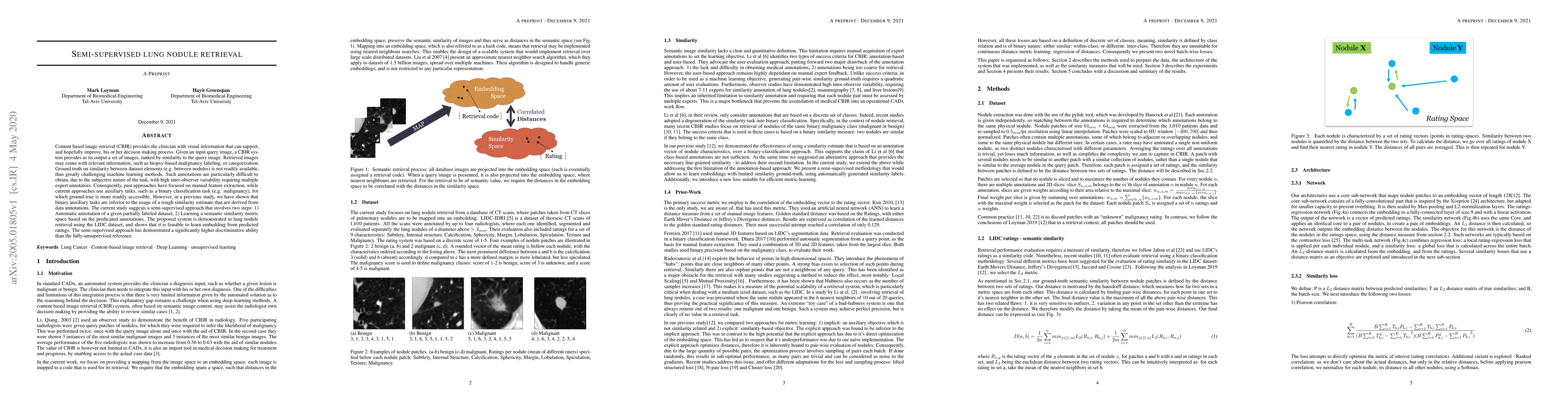 Content based image retrieval (CBIR) provides the clinician with visual information that can support, and hopefully improve, his or her decision making process. Given an input query image, a CBIR system provides as its output a set of images, ranked by similarity to the query image. Retrieved images may come with relevant information, such as biopsy-based malignancy labeling, or categorization. Ground truth on similarity between dataset elements (e.g. between nodules) is not readily available, thus greatly challenging machine learning methods. Such annotations are particularly difficult to obtain, due to the subjective nature of the task, with high inter-observer variability requiring multiple expert annotators. Consequently, past approaches have focused on manual feature extraction, while current approaches use auxiliary tasks, such as a binary classification task (e.g. malignancy), for which ground-true is more readily accessible. However, in a previous study, we have shown that binary auxiliary tasks are inferior to the usage of a rough similarity estimate that are derived from data annotations. The current study suggests a semi-supervised approach that involves two steps: 1) Automatic annotation of a given partially labeled dataset; 2) Learning a semantic similarity metric space based on the predicated annotations. The proposed system is demonstrated in lung nodule retrieval using the LIDC dataset, and shows that it is feasible to learn embedding from predicted ratings. The semi-supervised approach has demonstrated a significantly higher discriminative ability than the fully-unsupervised reference.