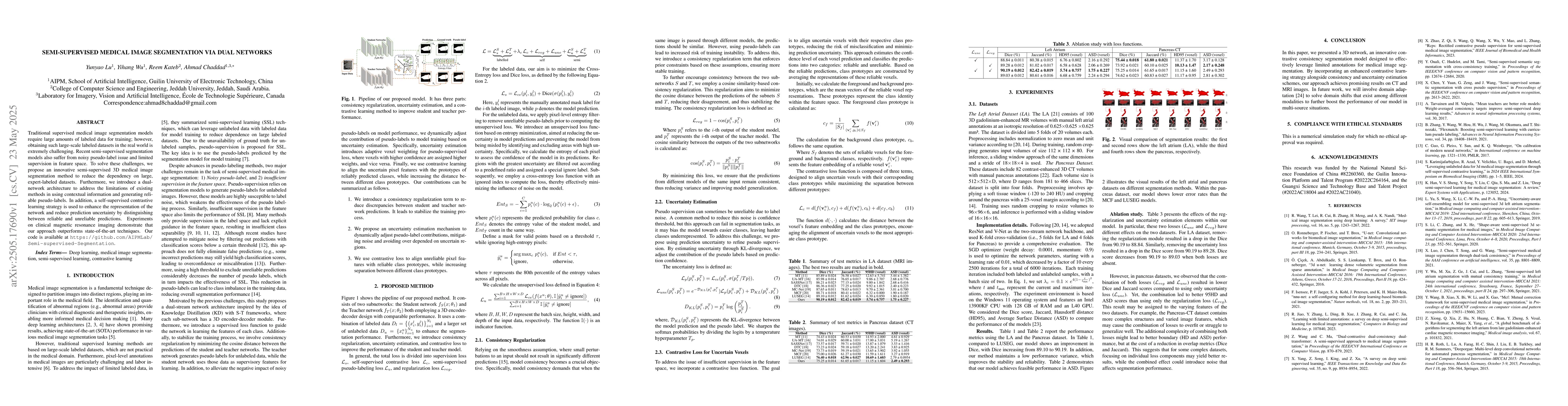 This paper proposes a novel semi-supervised method for medical image segmentation that outperforms state-of-the-art techniques using a dual-network architecture and self-supervised contrastive learning strategy.