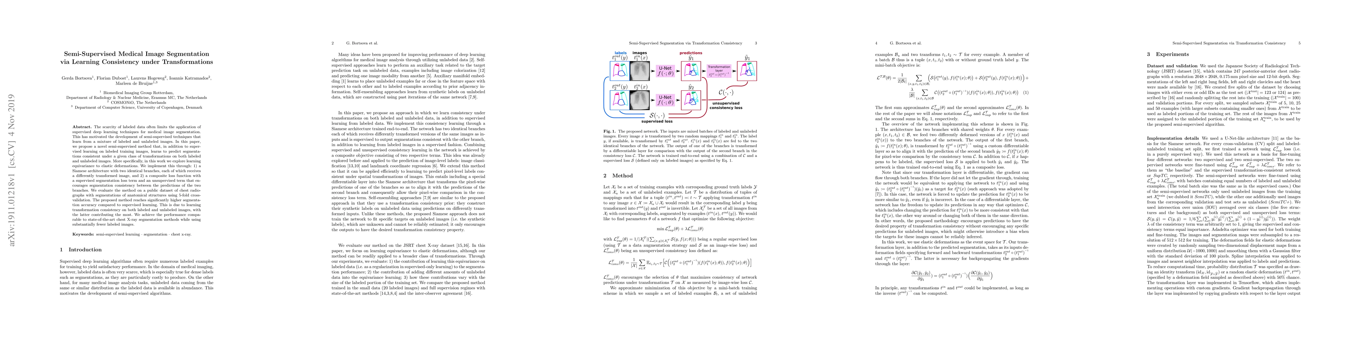 This paper proposes a semi-supervised method for medical image segmentation that leverages both labeled and unlabeled data by learning segmentation consistency under elastic deformations. The method uses a Siamese architecture and achieves higher accuracy compared to supervised learning, especially benefiting from unlabeled data.