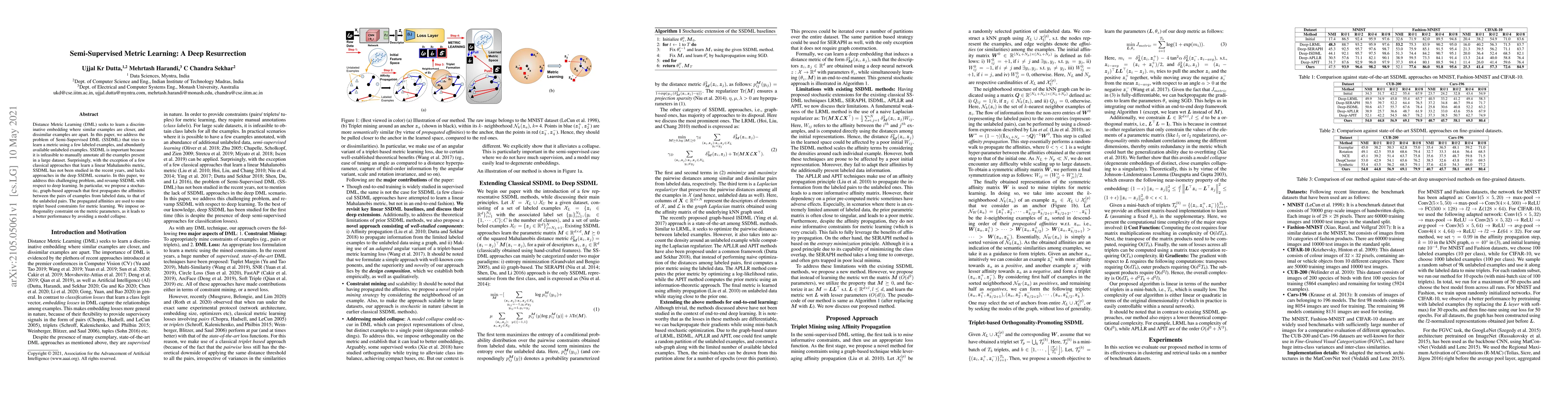 This paper proposes a novel deep learning approach for Semi-Supervised Distance Metric Learning (SSDML) that leverages both labeled and unlabeled data. It introduces a stochastic, graph-based method to propagate affinities from labeled to unlabeled pairs, using triplet constraints for metric learning, and imposes an orthogonality constraint to enhance performance.