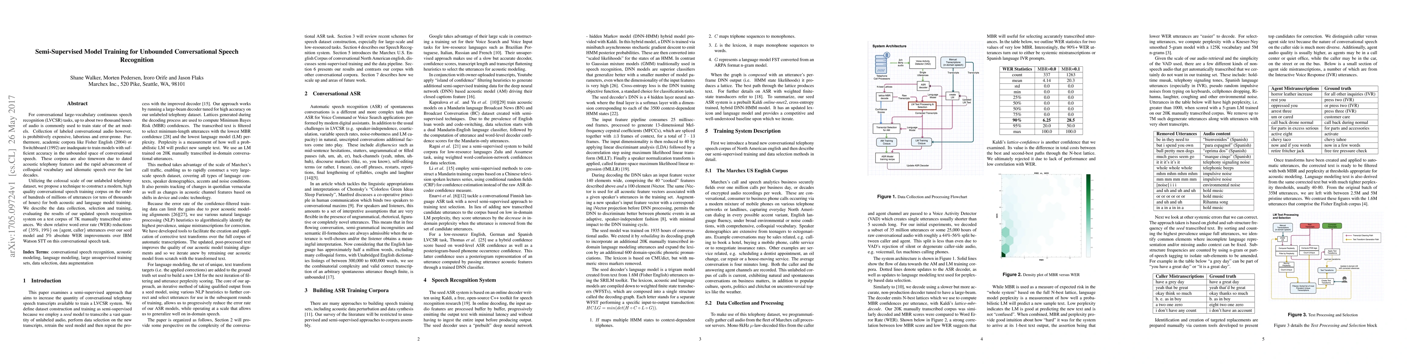 This paper proposes a semi-supervised model training technique to create a large-scale, high-quality conversational speech recognition corpus from unlabeled telephony data. The method achieves significant improvements in word error rates, demonstrating a 35% reduction for agents and a 5% absolute improvement over IBM Watson STT.