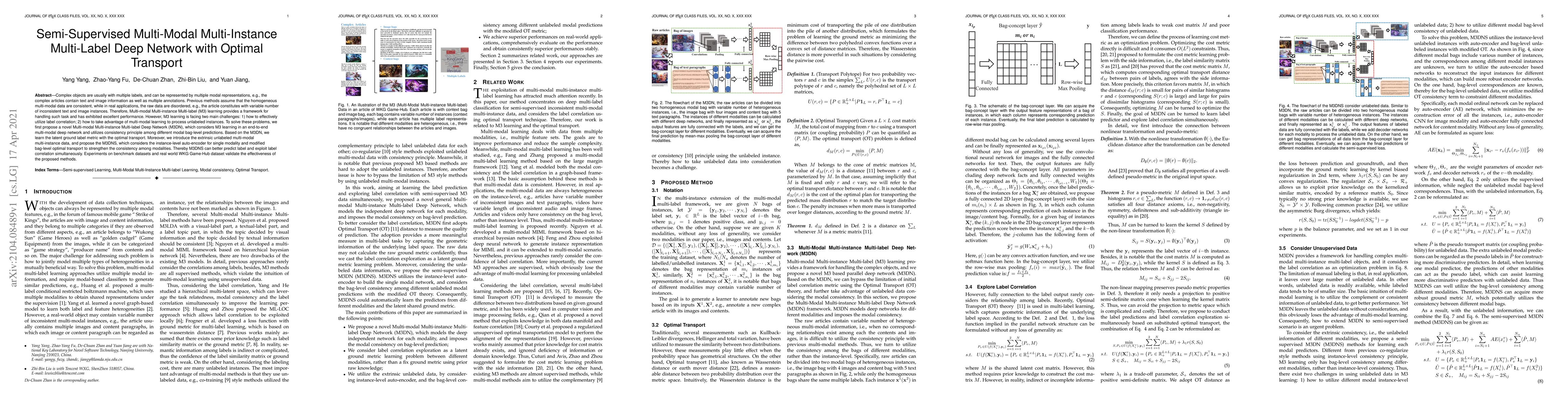 This paper proposes a novel Multi-modal Multi-instance Multi-label Deep Network (M3DN) to address the challenges of utilizing label correlation and leveraging unlabeled data in complex, multi-modal datasets. The method incorporates optimal transport to learn a latent ground label metric and enhances consistency among modalities, validated through experiments on benchmark and real-world datasets.