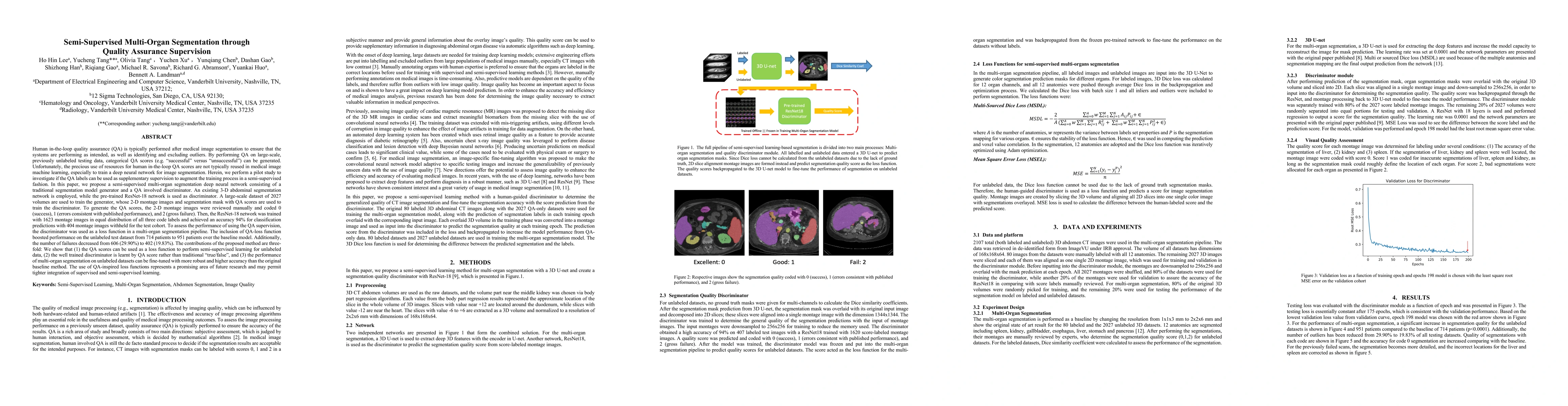 Human in-the-loop quality assurance (QA) is typically performed after medical image segmentation to ensure that the systems are performing as intended, as well as identifying and excluding outliers. By performing QA on large-scale, previously unlabeled testing data, categorical QA scores can be generatedIn this paper, we propose a semi-supervised multi-organ segmentation deep neural network consisting of a traditional segmentation model generator and a QA involved discriminator. A large-scale dataset of 2027 volumes are used to train the generator, whose 2-D montage images and segmentation mask with QA scores are used to train the discriminator. To generate the QA scores, the 2-D montage images were reviewed manually and coded 0 (success), 1 (errors consistent with published performance), and 2 (gross failure). Then, the ResNet-18 network was trained with 1623 montage images in equal distribution of all three code labels and achieved an accuracy 94% for classification predictions with 404 montage images withheld for the test cohort. To assess the performance of using the QA supervision, the discriminator was used as a loss function in a multi-organ segmentation pipeline. The inclusion of QA-loss function boosted performance on the unlabeled test dataset from 714 patients to 951 patients over the baseline model. Additionally, the number of failures decreased from 606 (29.90%) to 402 (19.83%). The contributions of the proposed method are threefold: We show that (1) the QA scores can be used as a loss function to perform semi-supervised learning for unlabeled data, (2) the well trained discriminator is learnt by QA score rather than traditional true/false, and (3) the performance of multi-organ segmentation on unlabeled datasets can be fine-tuned with more robust and higher accuracy than the original baseline method.