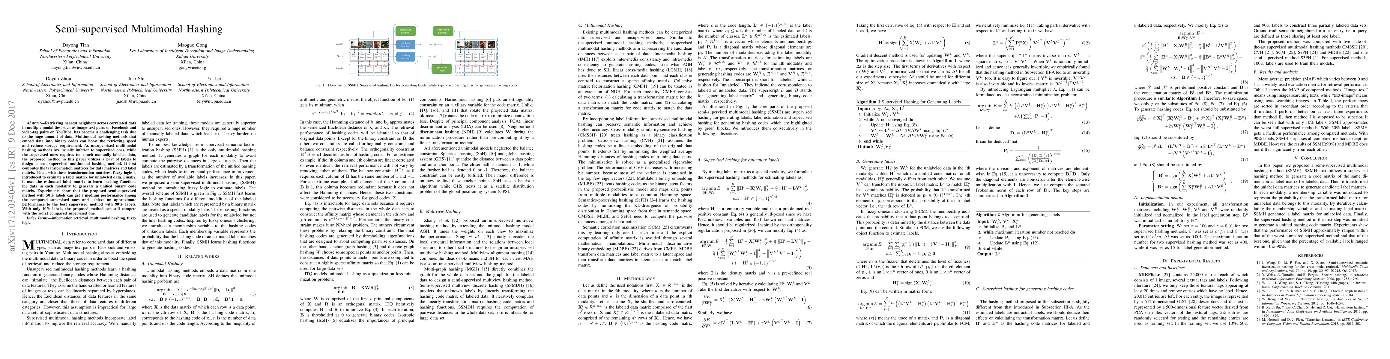 This paper proposes a semi-supervised multimodal hashing method to efficiently retrieve nearest neighbors across large-scale correlated data in multiple modalities. It leverages a small portion of labeled data to estimate labels for unlabeled data, generating unified binary codes that achieve competitive performance compared to fully supervised methods.