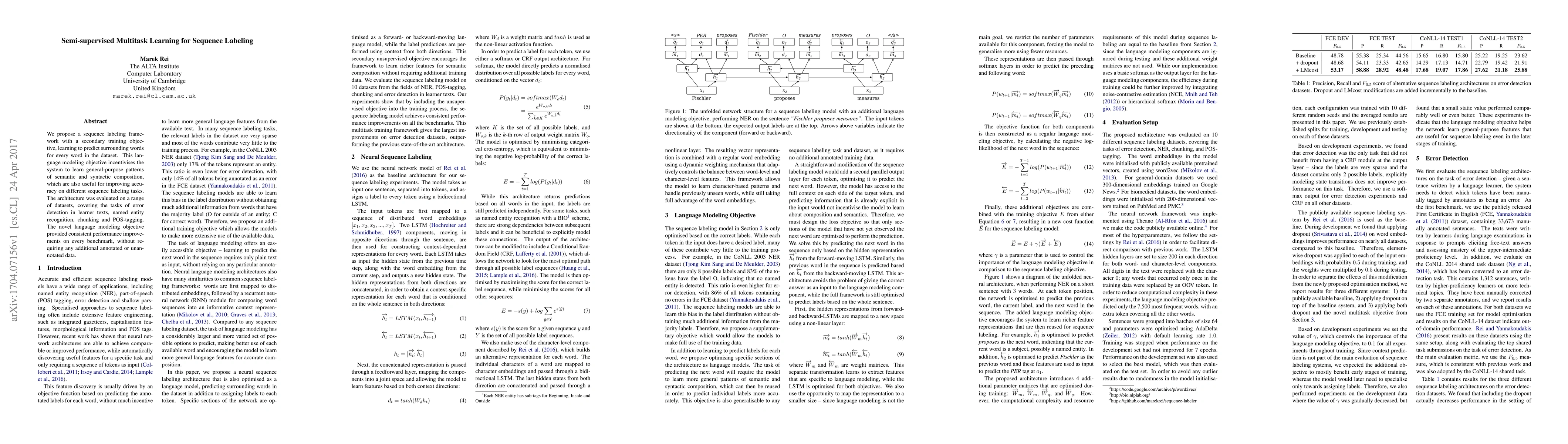 We propose a sequence labeling framework with a secondary training objective, learning to predict surrounding words for every word in the dataset. This language modeling objective incentivises the system to learn general-purpose patterns of semantic and syntactic composition, which are also useful for improving accuracy on different sequence labeling tasks. The architecture was evaluated on a range of datasets, covering the tasks of error detection in learner texts, named entity recognition, chunking and POS-tagging. The novel language modeling objective provided consistent performance improvements on every benchmark, without requiring any additional annotated or unannotated data.