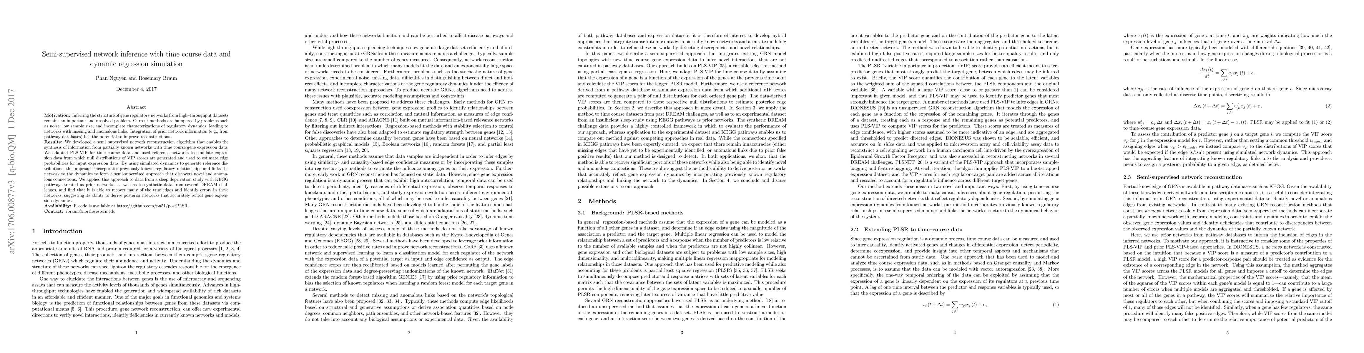 Motivation: Inferring the structure of gene regulatory networks from high--throughput datasets remains an important and unsolved problem. Current methods are hampered by problems such as noise, low sample size, and incomplete characterizations of regulatory dynamics, leading to networks with missing and anomalous links. Integration of prior network information (e.g., from pathway databases) has the potential to improve reconstructions. Results: We developed a semi--supervised network reconstruction algorithm that enables the synthesis of information from partially known networks with time course gene expression data. We adapted PLS-VIP for time course data and used reference networks to simulate expression data from which null distributions of VIP scores are generated and used to estimate edge probabilities for input expression data. By using simulated dynamics to generate reference distributions, this approach incorporates previously known regulatory relationships and links the network to the dynamics to form a semi-supervised approach that discovers novel and anomalous connections. We applied this approach to data from a sleep deprivation study with KEGG pathways treated as prior networks, as well as to synthetic data from several DREAM challenges, and find that it is able to recover many of the true edges and identify errors in these networks, suggesting its ability to derive posterior networks that accurately reflect gene expression dynamics.