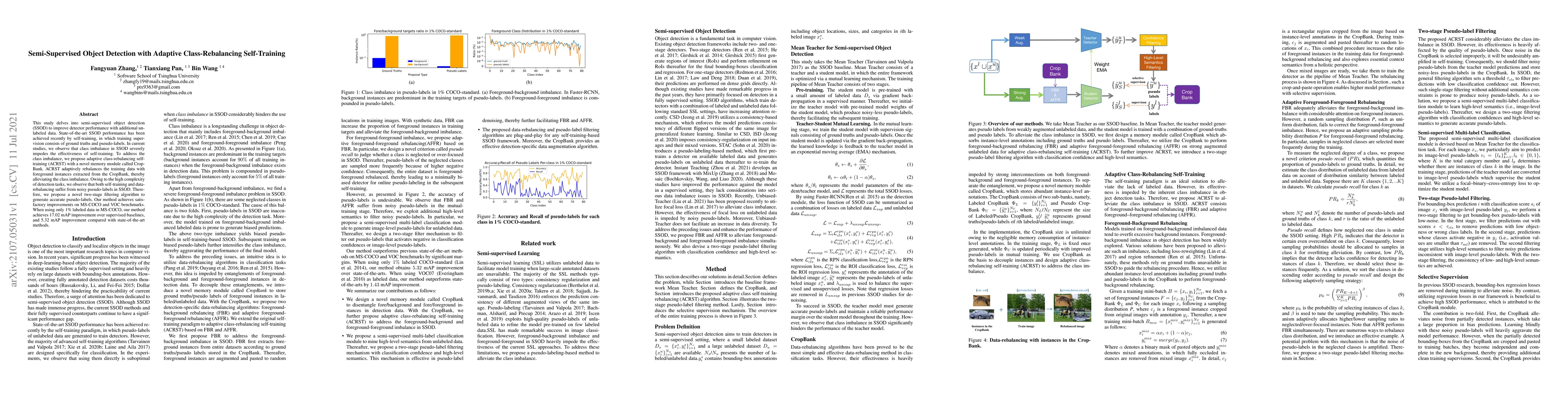 This study proposes adaptive class-rebalancing self-training (ACRST) to enhance semi-supervised object detection, addressing class imbalance with a CropBank memory module and a two-stage filtering algorithm for accurate pseudo-labels, achieving significant improvements on MS-COCO and VOC benchmarks.