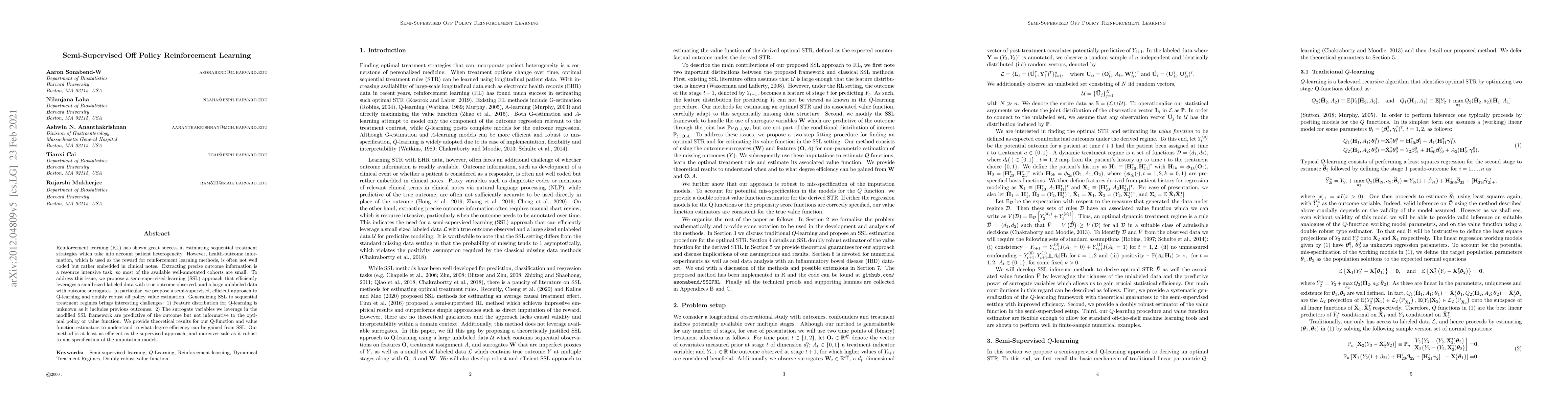 This paper proposes a semi-supervised reinforcement learning method to efficiently leverage small labeled datasets and large unlabeled datasets with surrogate outcomes for estimating sequential treatment strategies in healthcare. The method is theoretically shown to be at least as efficient as supervised approaches while being robust to model mis-specification.