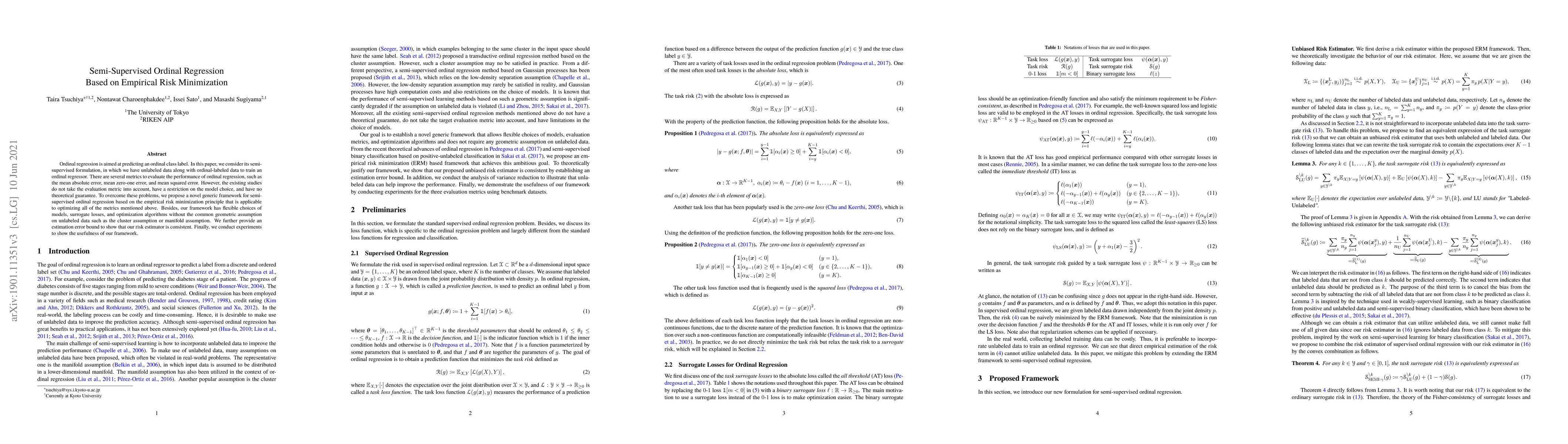 This paper proposes a novel semi-supervised framework for ordinal regression based on empirical risk minimization, offering flexible model choices without geometric assumptions. It provides theoretical guarantees and outperforms existing methods in various evaluation metrics.