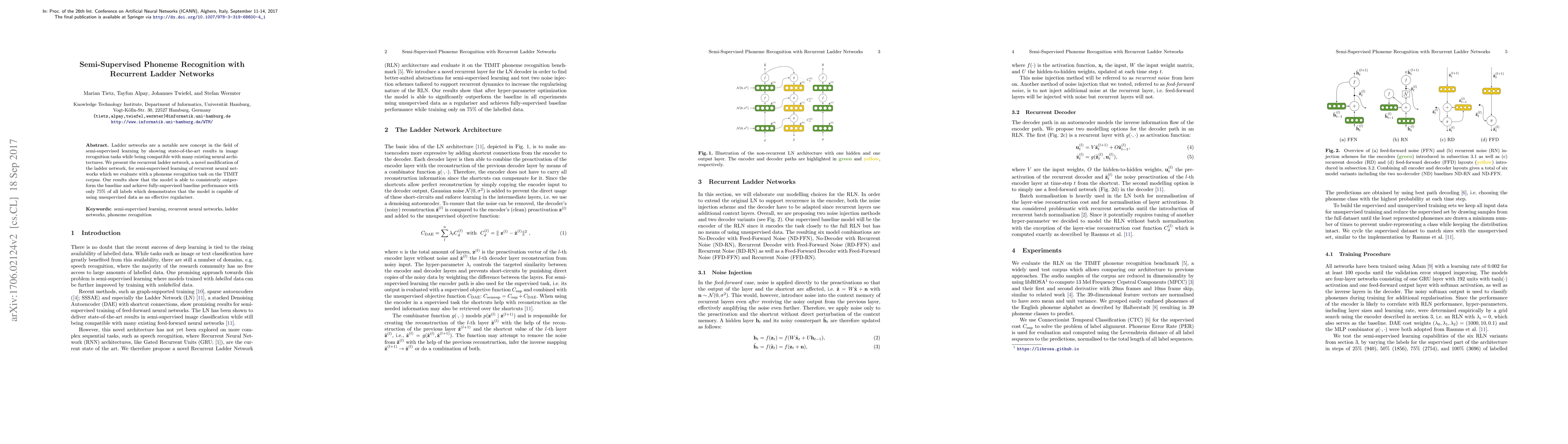 This paper introduces a recurrent ladder network for semi-supervised phoneme recognition, achieving state-of-the-art results by leveraging both labeled and unlabeled data. The model demonstrates comparable performance to fully-supervised methods using only 75% of the available labels.