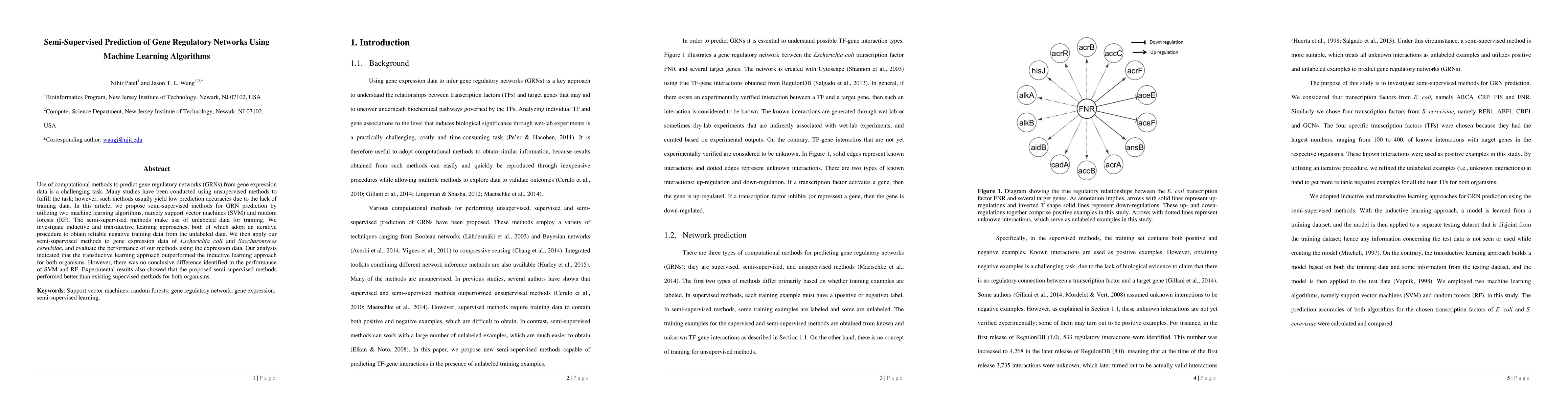 This paper proposes semi-supervised methods using SVM and RF to predict gene regulatory networks from gene expression data, achieving better results than supervised methods. The transductive learning approach showed superior performance over inductive learning in Escherichia coli and Saccharomyces cerevisiae.