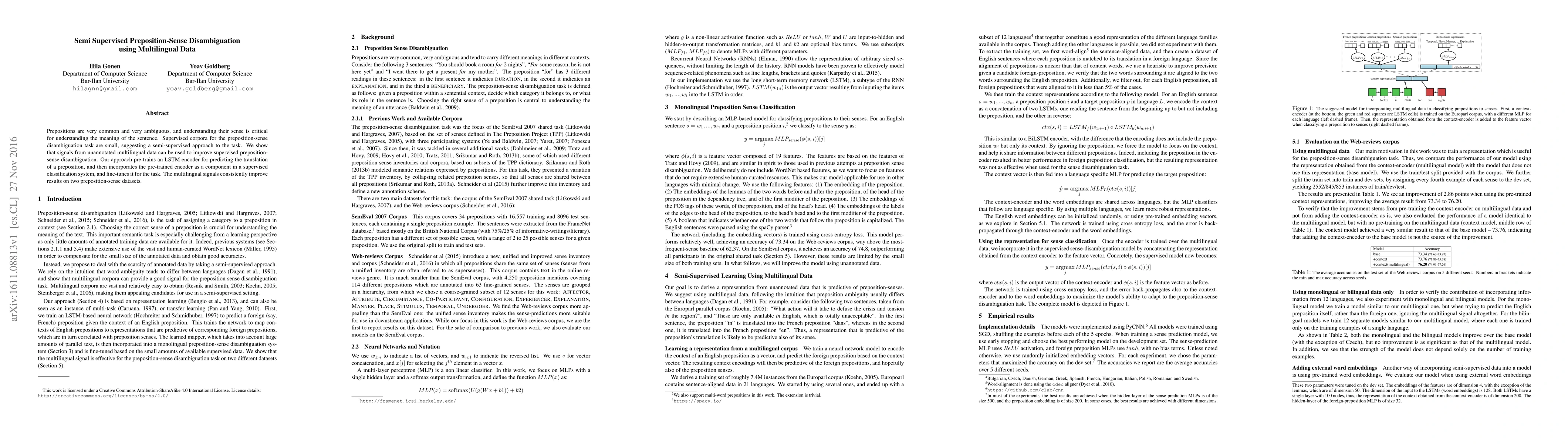 This paper proposes a semi-supervised method for preposition-sense disambiguation, leveraging unannotated multilingual data to enhance supervised learning. The method trains an LSTM encoder using multilingual data, then integrates it into a supervised classifier and fine-tunes it, achieving better results on two datasets.
