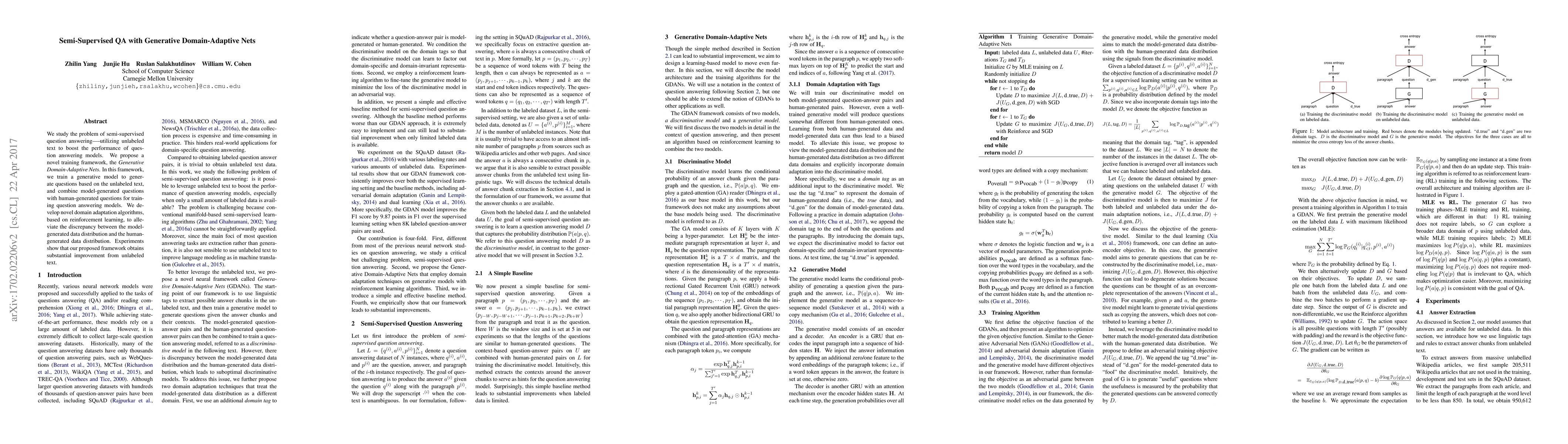 This paper proposes a semi-supervised question answering framework using Generative Domain-Adaptive Nets, which leverages unlabeled text to enhance model performance. The framework combines human-generated and model-generated questions, employing reinforcement learning-based domain adaptation to bridge data distribution gaps, resulting in significant performance improvements.