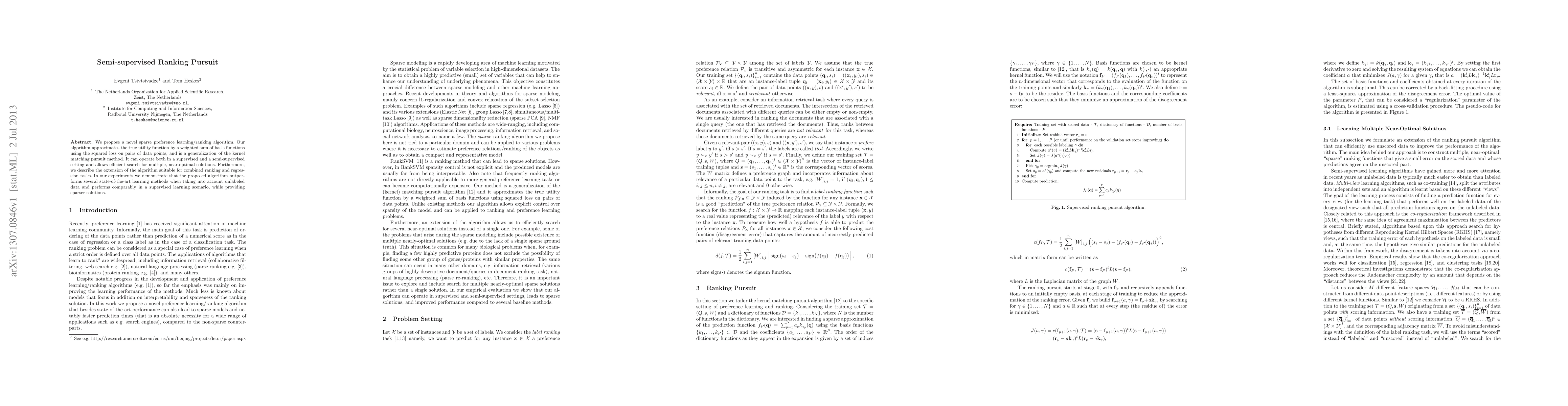The paper introduces a novel sparse ranking algorithm that generalizes the kernel matching pursuit method, capable of operating in both supervised and semi-supervised settings, and effectively handles combined ranking and regression tasks. Experimental results show that it outperforms other state-of-the-art methods when utilizing unlabeled data while providing sparser solutions.