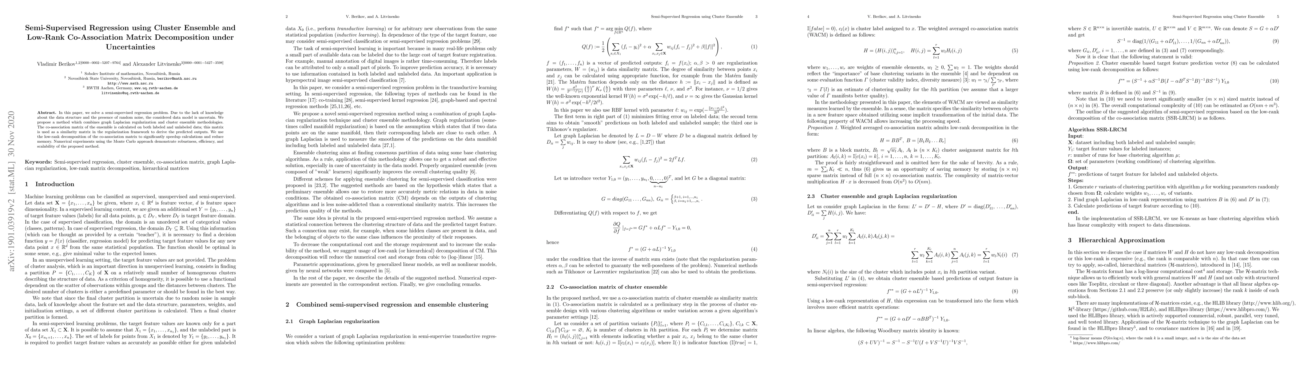 This paper proposes a method to solve semi-supervised regression problems under uncertainties using graph Laplacian regularization and cluster ensemble methodologies.
