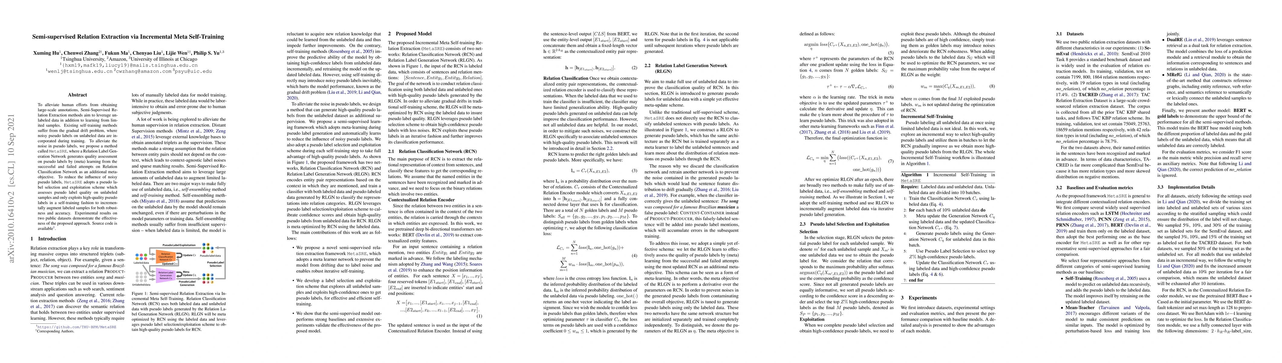 The paper proposes MetaSRE, a semi-supervised relation extraction method that uses incremental meta self-training to improve accuracy and robustness by selectively incorporating high-quality pseudo labels from unlabeled data, thereby mitigating the gradual drift problem. Experimental results show improved performance on public datasets.