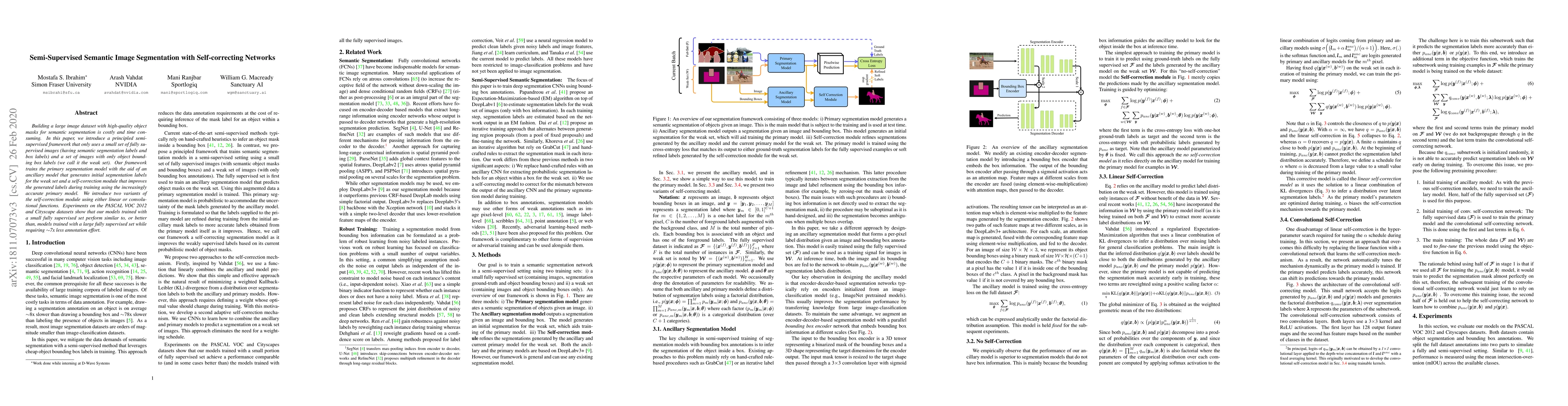 Building a large image dataset with high-quality object masks for semantic segmentation is costly and time consuming. In this paper, we introduce a principled semi-supervised framework that only uses a small set of fully supervised images (having semantic segmentation labels and box labels) and a set of images with only object bounding box labels (we call it the weak set). Our framework trains the primary segmentation model with the aid of an ancillary model that generates initial segmentation labels for the weak set and a self-correction module that improves the generated labels during training using the increasingly accurate primary model. We introduce two variants of the self-correction module using either linear or convolutional functions. Experiments on the PASCAL VOC 2012 and Cityscape datasets show that our models trained with a small fully supervised set perform similar to, or better than, models trained with a large fully supervised set while requiring ~7x less annotation effort.