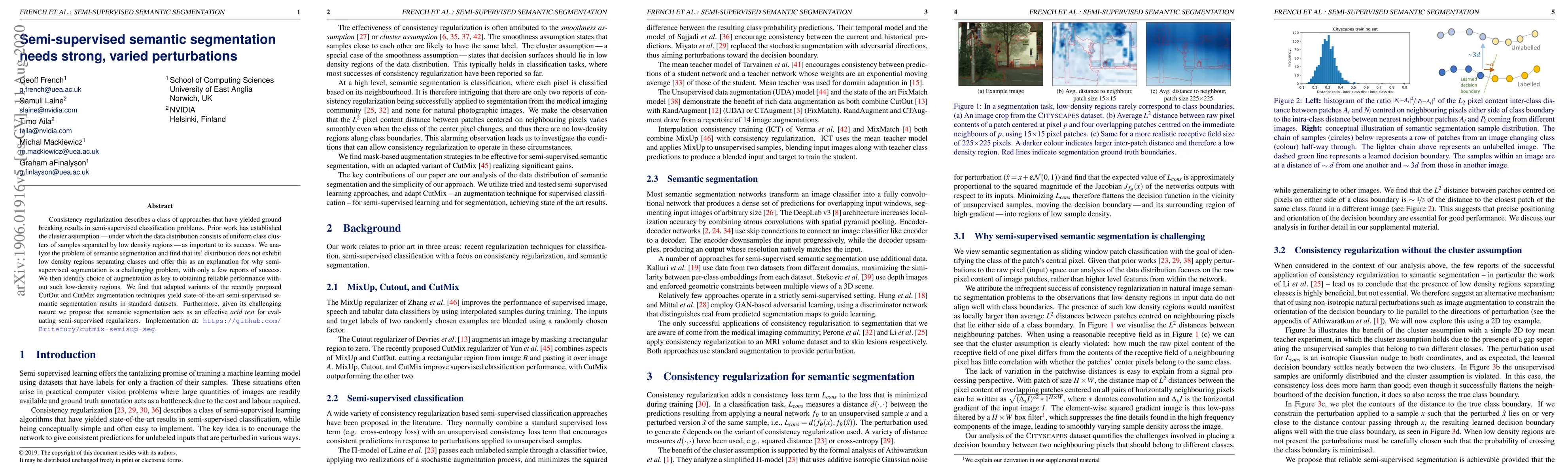 This paper explores the challenges of semi-supervised semantic segmentation due to the lack of low-density regions separating classes, emphasizing the importance of strong, varied perturbations for success. State-of-the-art results are achieved using adapted CutOut and CutMix augmentation techniques, demonstrating their effectiveness in this domain.