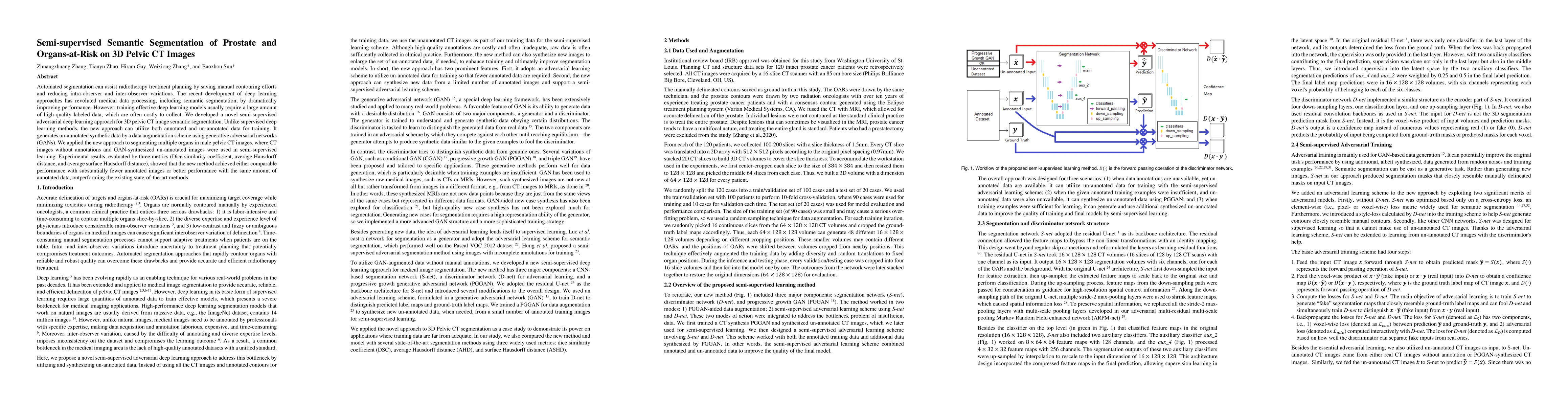 This paper introduces a semi-supervised adversarial deep learning method for semantic segmentation of prostate and organs-at-risk in 3D pelvic CT images, utilizing both labeled and unlabeled data. The approach outperforms existing methods, achieving comparable or better segmentation performance with fewer annotated images.