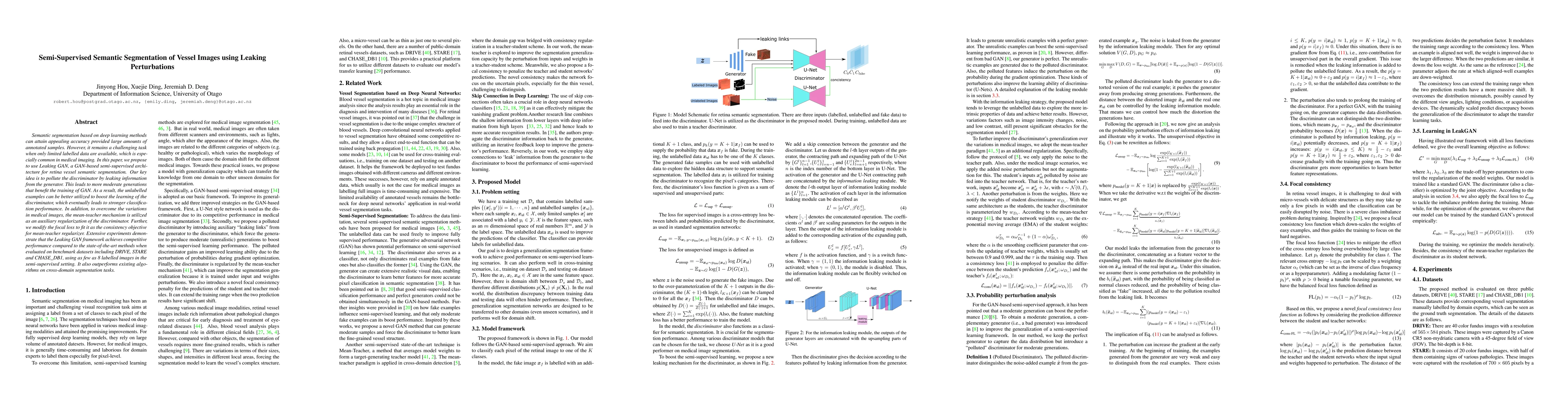 This paper proposes a semi-supervised semantic segmentation framework for vessel images using Leaking GAN, achieving competitive performance with limited labeled data and outperforming existing algorithms in cross-domain tasks.