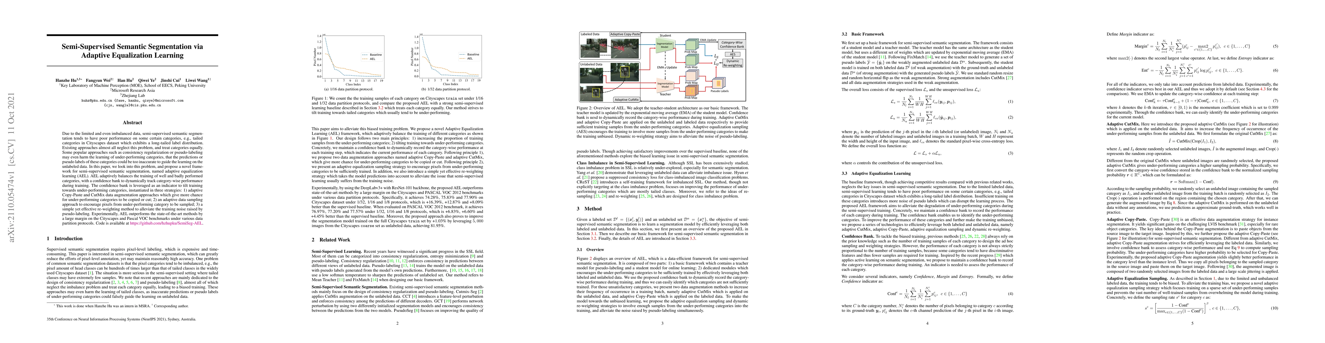 This paper proposes adaptive equalization learning (AEL) to address the performance disparity in semi-supervised semantic segmentation, particularly for tailed categories. AEL dynamically balances training focus on well and poorly performing categories using a confidence bank, employing adaptive data augmentation, sampling, and re-weighting strategies to enhance under-performing categories. Experimental results show significant improvements over state-of-the-art methods on Cityscapes and Pascal VOC datasets.