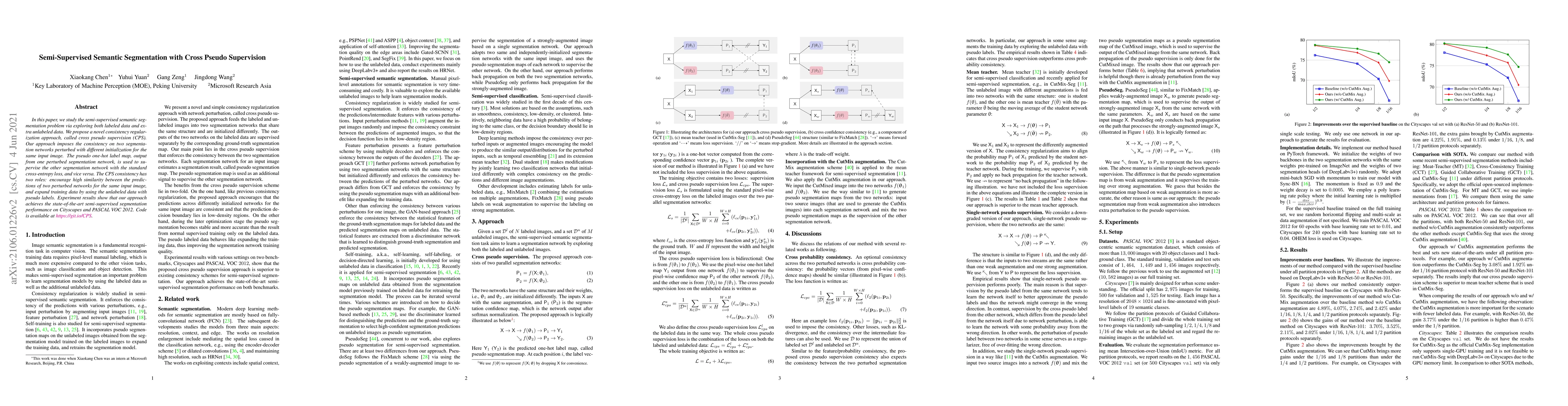 This paper proposes a semi-supervised semantic segmentation method using cross pseudo supervision (CPS) to leverage both labeled and unlabeled data. CPS enforces consistency between two differently initialized segmentation networks on the same input, utilizing pseudo labels to supervise each other, achieving state-of-the-art results on Cityscapes and PASCAL VOC 2012 datasets.