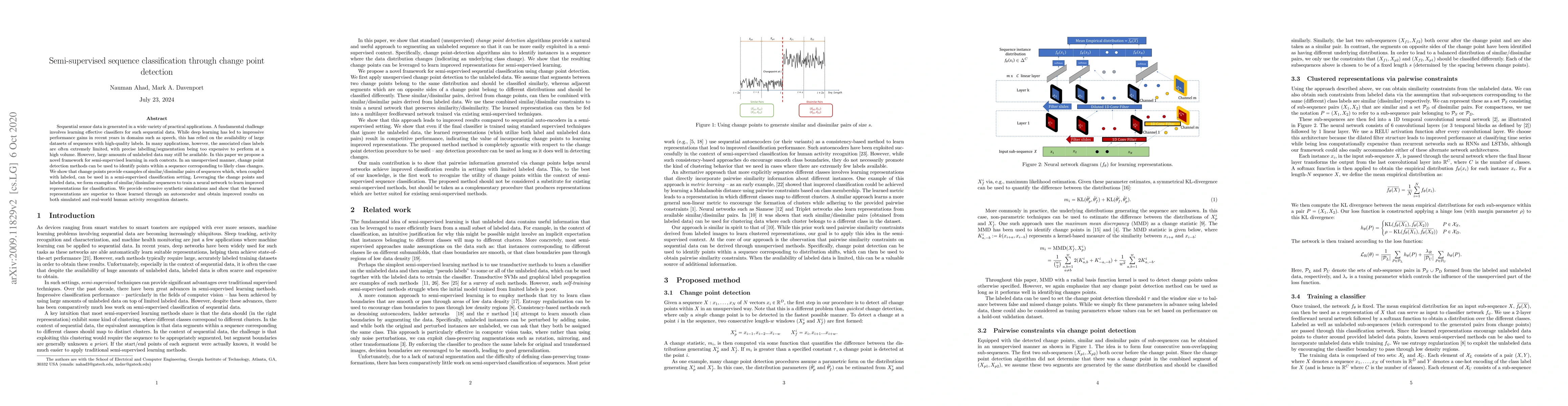 This paper introduces a semi-supervised learning framework for classifying sequential sensor data, addressing the challenge of limited labeled data. The method uses change point detection to find likely class transitions in unlabeled sequences, creating useful 'similar/dissimilar' sequence pairs. These pairs, combined with limited labeled data, are used to train a neural network, resulting in improved classification performance over traditional autoencoder-based methods on both synthetic and real human activity datasets.