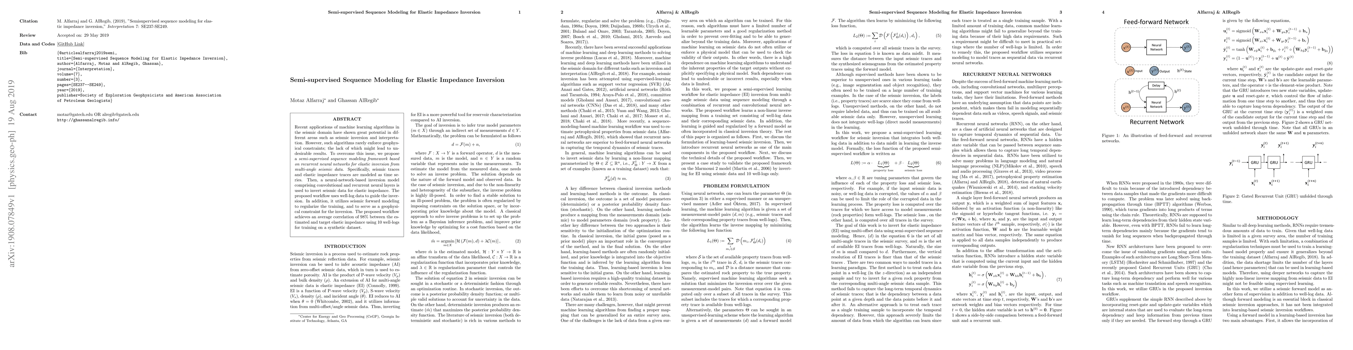This paper introduces a semi-supervised sequence modeling framework using recurrent neural networks for elastic impedance inversion from multi-angle seismic data, incorporating well-log data and seismic forward modeling to enforce geophysical constraints, achieving a 98% correlation with target EI.