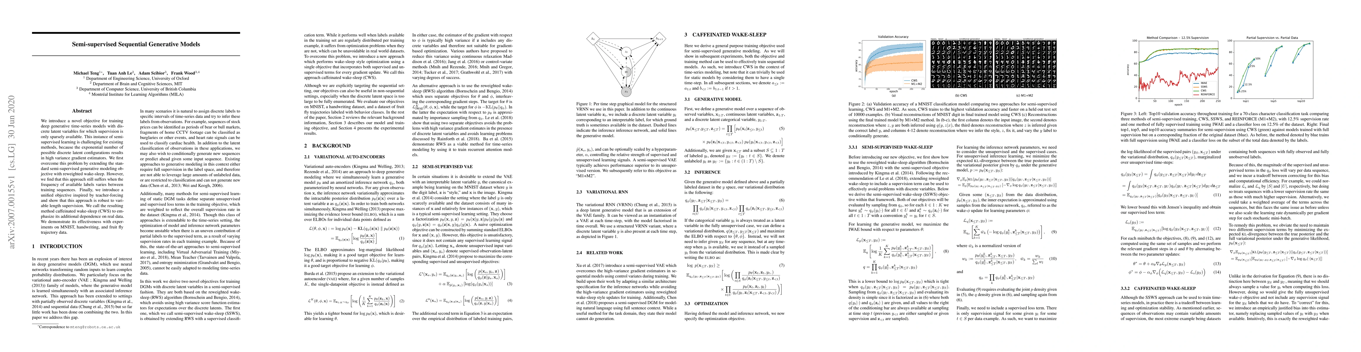 This paper presents a novel semi-supervised learning method called caffeinated wake-sleep (CWS) for training deep generative time-series models with sparse supervision. The method addresses high variance gradient estimators by extending the semi-supervised objective with reweighted wake-sleep and further improves robustness to variable label frequency.