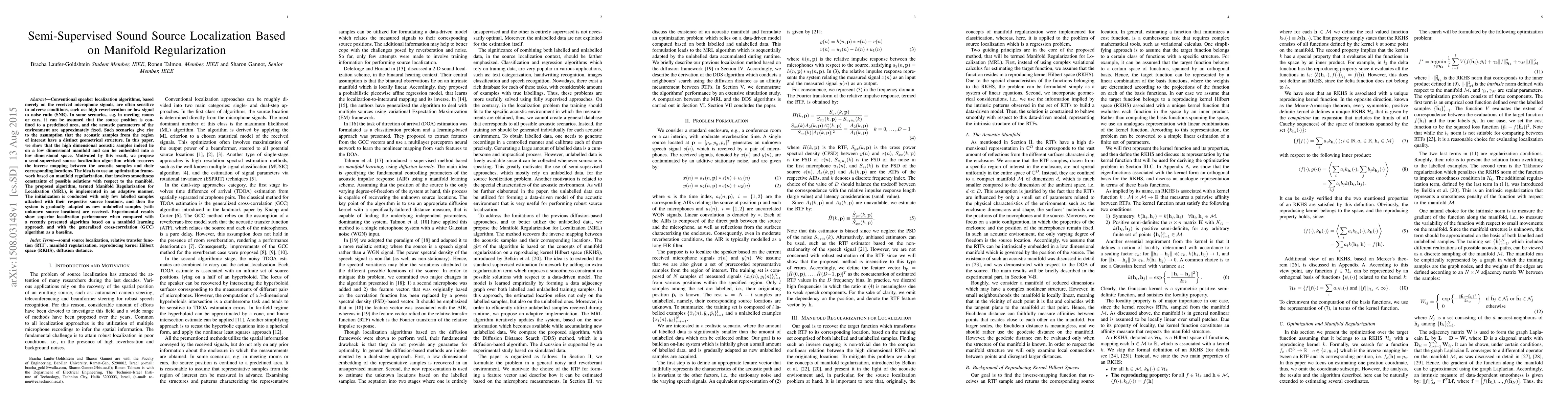 Researchers propose a semi-supervised sound source localization algorithm using manifold regularization to improve performance in adverse conditions, leveraging the assumption that acoustic samples lie on a confined, low-dimensional manifold.
