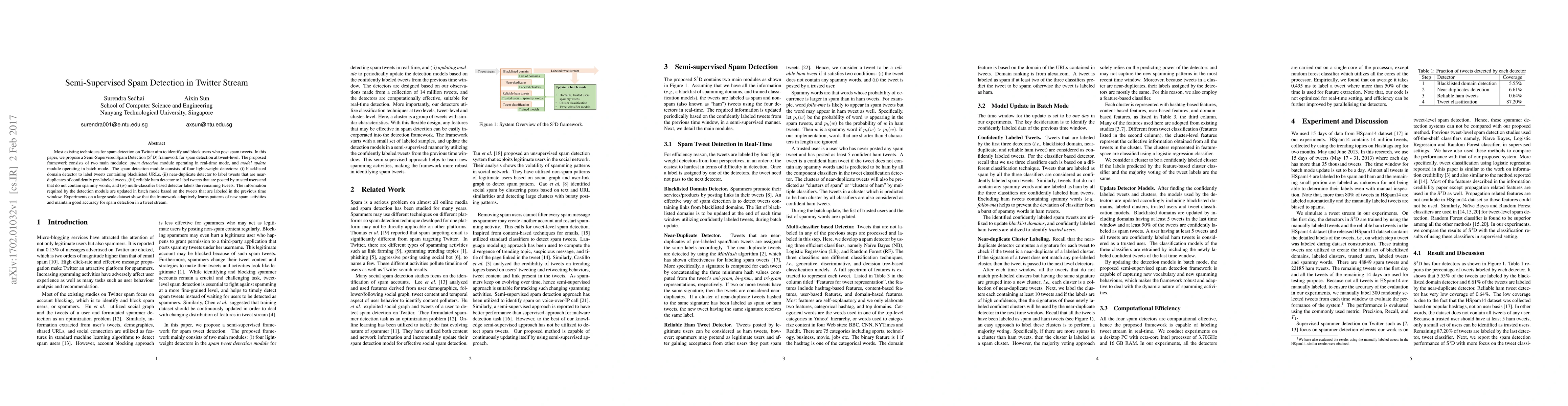 This paper introduces a Semi-Supervised Spam Detection (S3D) framework for real-time spam detection at the tweet level on Twitter. The framework includes a real-time spam detection module and a batch-based model update module, utilizing lightweight detectors to identify spam based on URL blacklists, near-duplicates, trusted user posts, and multi-classifier analysis.