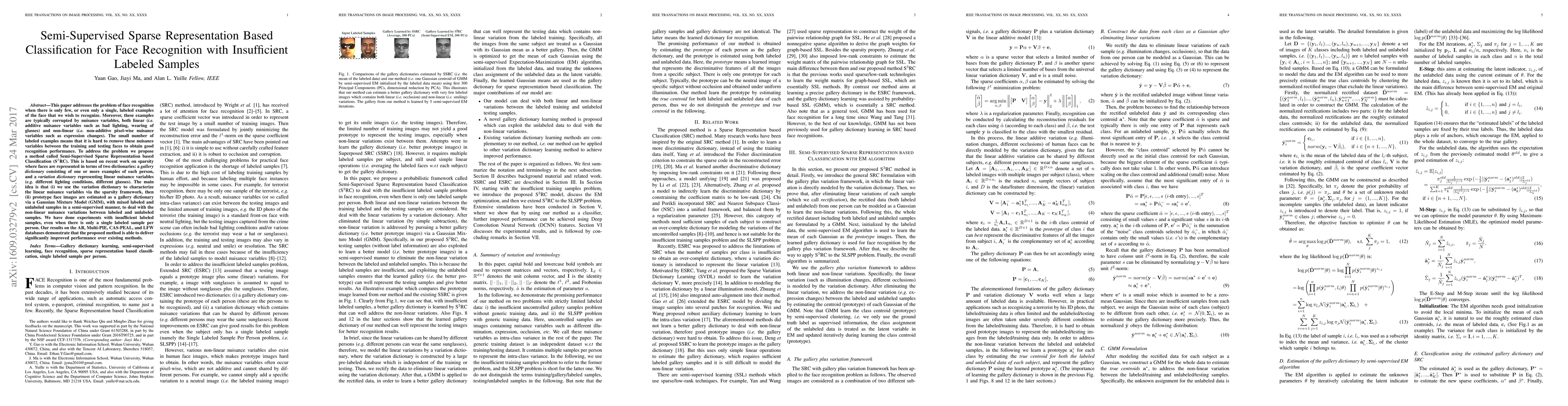 This paper proposes a Semi-Supervised Sparse Representation based Classification (S$^3$RC) method for face recognition with limited labeled samples, addressing both linear and non-linear nuisance variables. The method uses a variation dictionary to model linear variations and a Gaussian Mixture Model to estimate prototype faces from mixed labeled and unlabeled samples, achieving better performance on several databases.