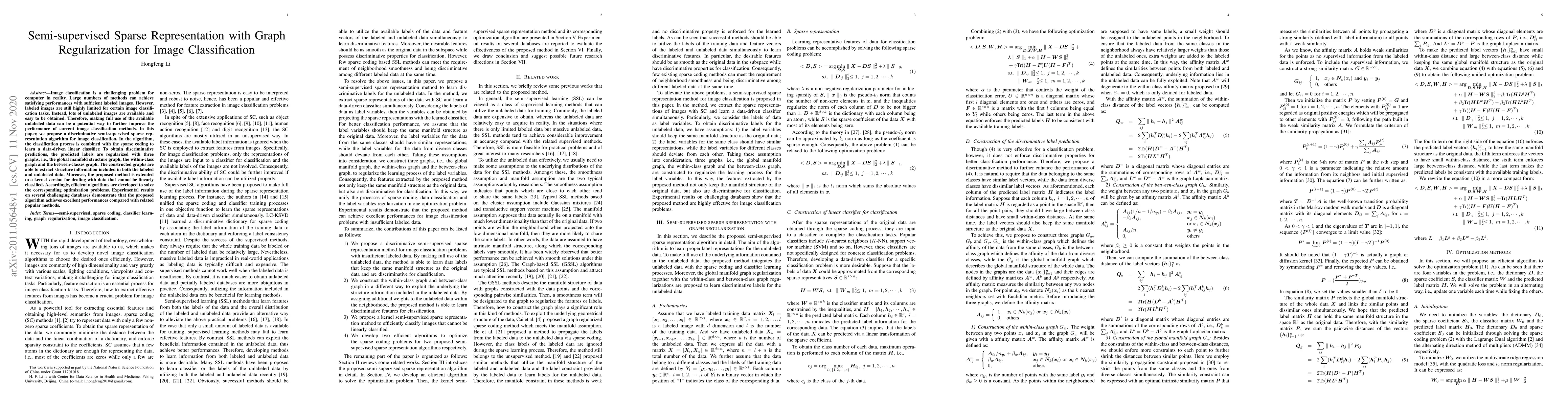 This paper proposes a semi-supervised sparse representation method for image classification that leverages both labeled and unlabeled data. It integrates graph regularization to extract structure information and improve classification performance, achieving superior results on various databases compared to existing methods.