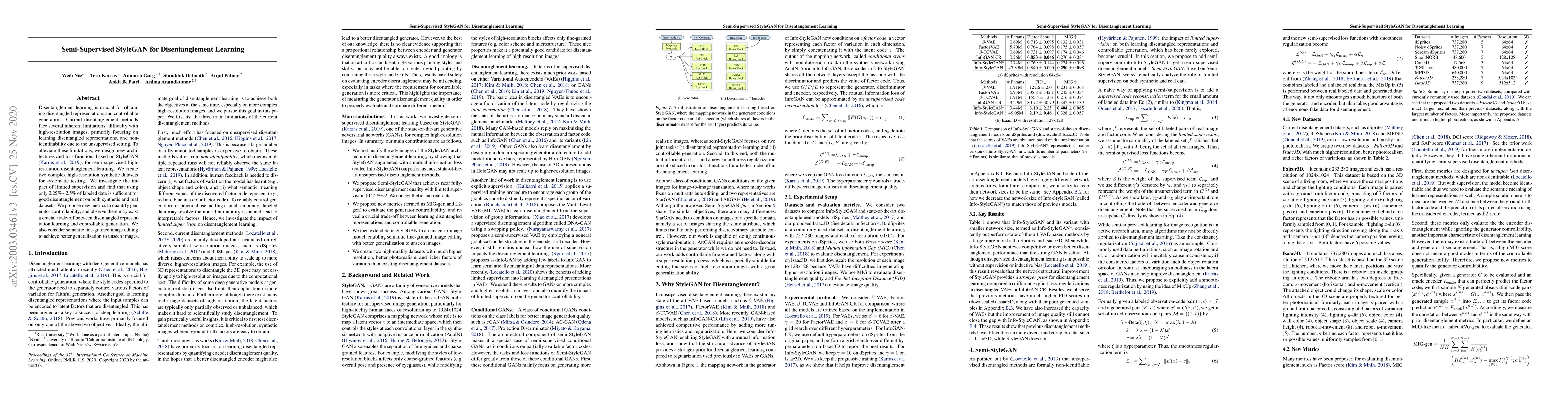 This paper proposes semi-supervised StyleGAN architectures and loss functions for high-resolution disentanglement learning, demonstrating that limited labeled data (0.25%~2.5%) suffices for effective disentanglement. It introduces new metrics for generator controllability and explores the trade-off between representation learning and generation control.